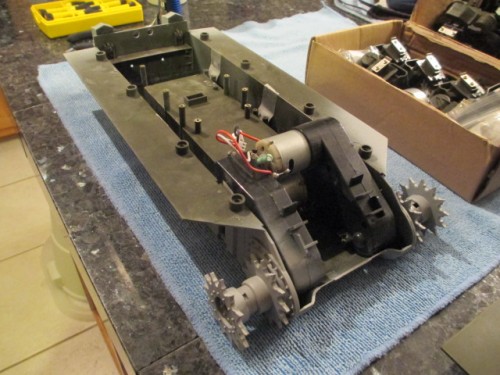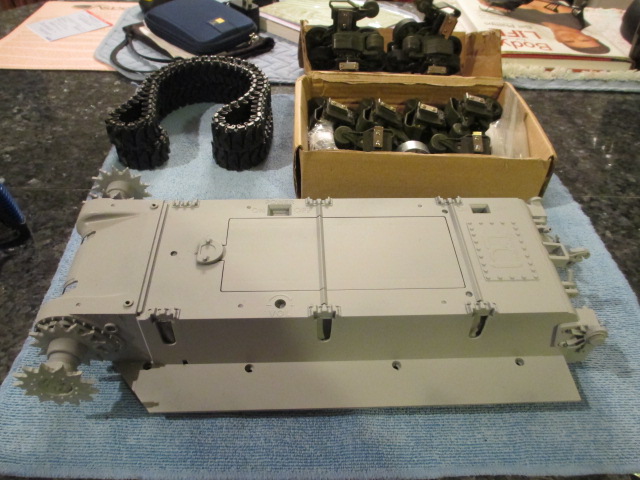 Nothing in the Post today but plenty yet to do. Tonight I removed the bogies and stock electronics from the lower hull and prepped it for priming. I added back a couple of pieces of the rear bulkhead and switched out the worn idler mounts for the new ones on the other lower. I primed it then using the same excellent Tamiya Lt. Grey that I used on 'Maxene'. Pictures:
