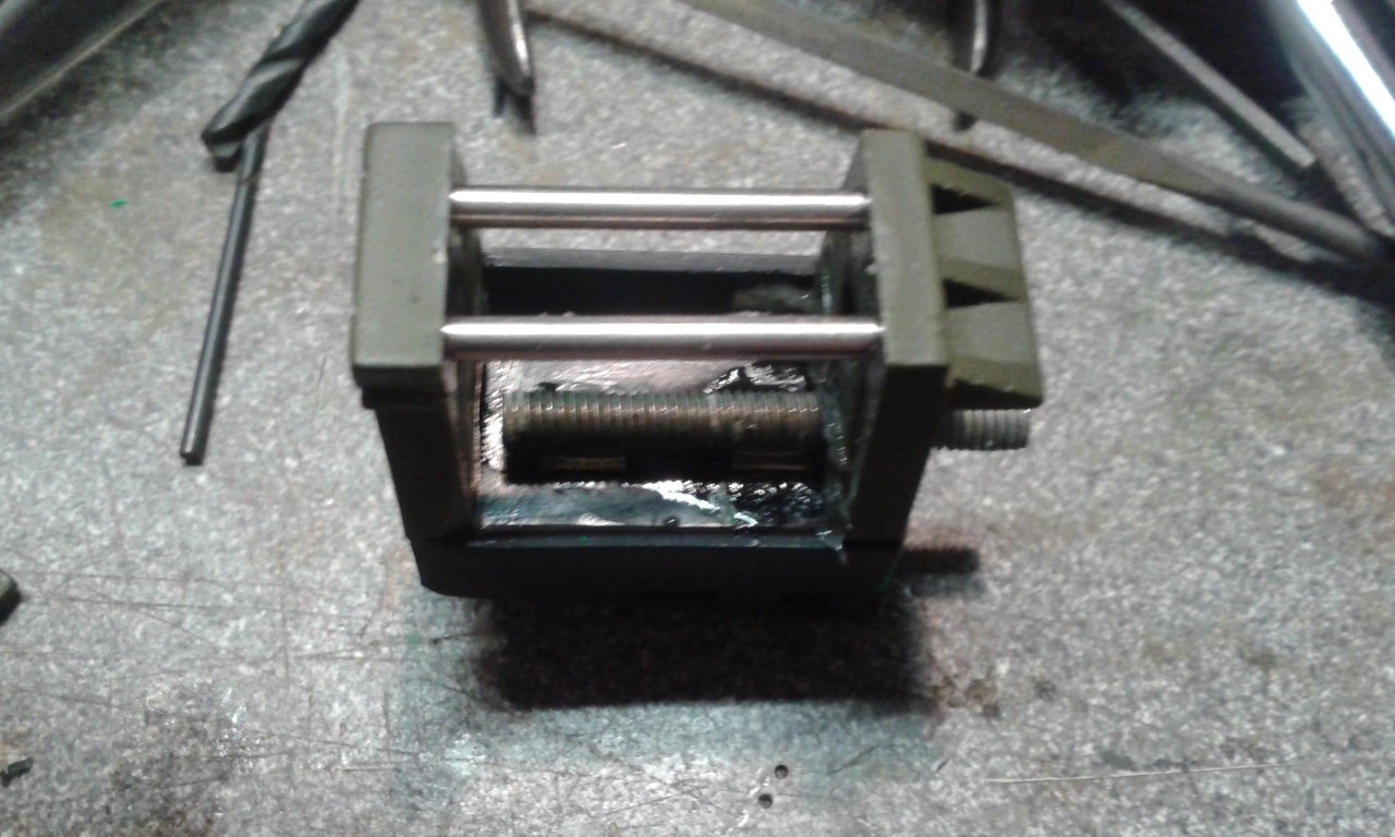I sealed up all the holes and gaps in the bogies and greased the inside of the back plate, and filled them with casting resin. What was a relatively frail structure is now a durable strong block holding the threaded rod and roller mounts all firmly