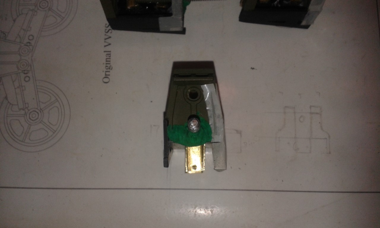 One of the previous pictures gives a good idea of the difference in shape of the two bogies, to get the front panel correct at the bottom where the cross pins go through I had to gently dremel them to give the correct shape, in effect it looks like the bottoms are lengthened whilst the tops are shortened.