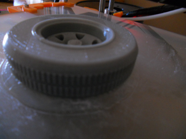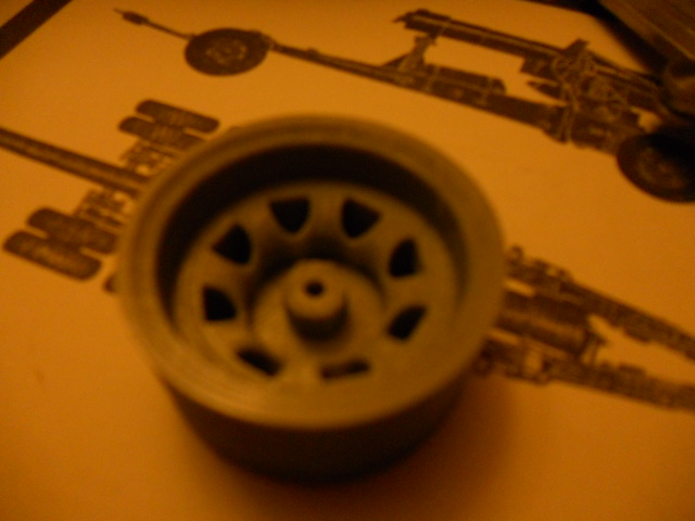 The basic design is there though, so a few adjustments,too many hollows it should be six, and I left too little material in the flat part of the hub centre, and then I need to mould tyres and tread, and print eight of them at over an hour each, plus a different style for the towing dolly.