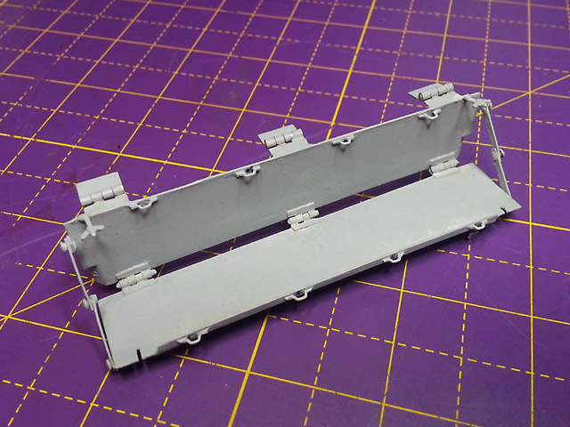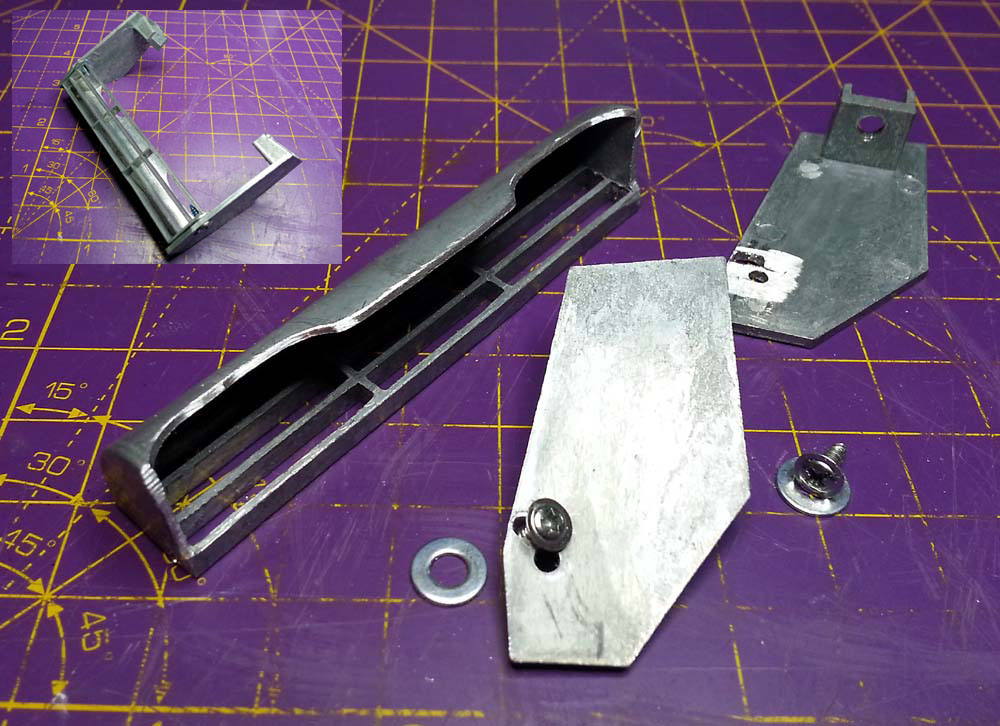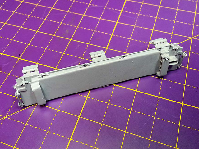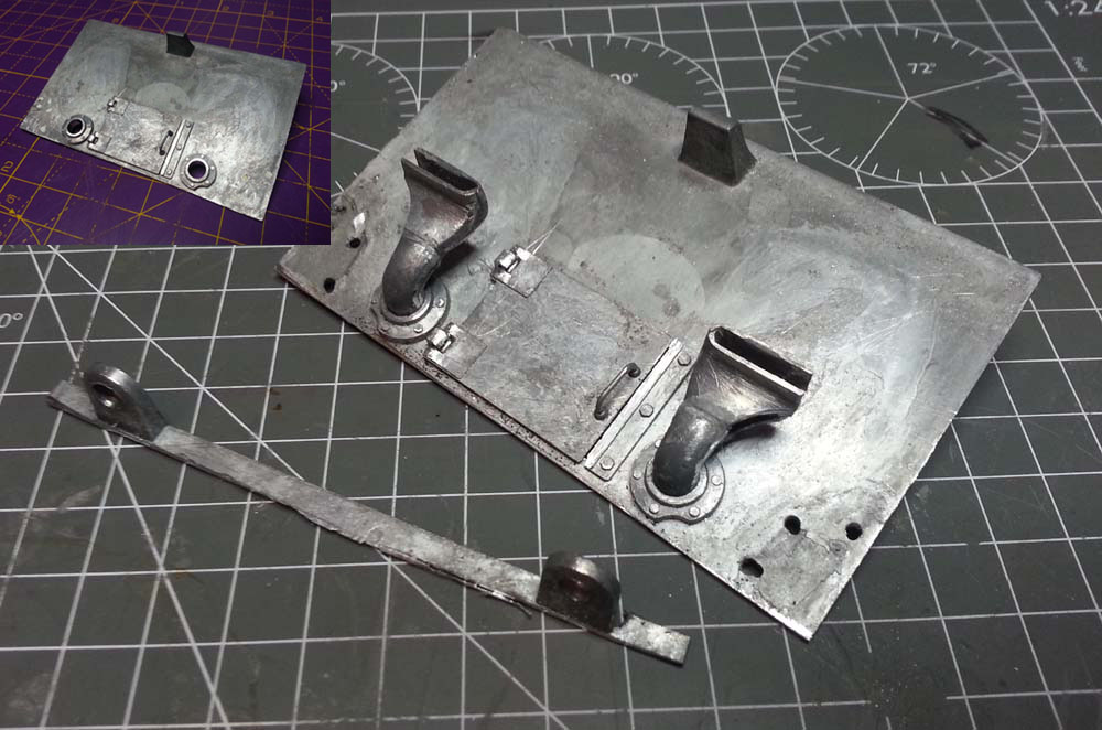 Next I had to modify the exhaust deflector and its mounting, which is part of the upper hull (to be tackled fully later) but needed to be done now to ensure a correct fit before moving on. I had grind the original fixing lugs off to re-position the pivot pins as, on the original, the placement meant the deflector drops down too far, obscuring the exhausts and stopping the door from opening properly. I also ground cutaways into the back upper edge of the deflector itself to ensure that, when it is down, the gases flow through efficiently - this is the only non-standard modification I have done but I have at present no schematic for the deflector design itself (but I'm guessing it will use some kind of baffle arrangement);