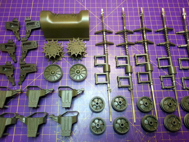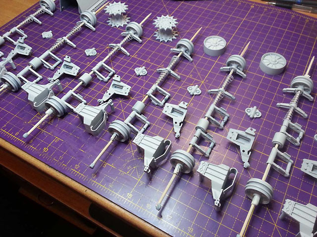 Anyway, thanks to EddyK I now have a super detailed, working, stowage rack which arrived in the post the other day. Excellent work Eddy, I'm deeply impressed at the quality of your work (the pictures really don't do justice to the fine detailing on this piece). With time limited at the moment I nonetheless managed to get on with the VVSS suspension bogies. Having removed all the mold marks and flashing, primed and painted these are now ready for assembly. Once this is done I will move on to the next stage, the lower hull bucket itself.