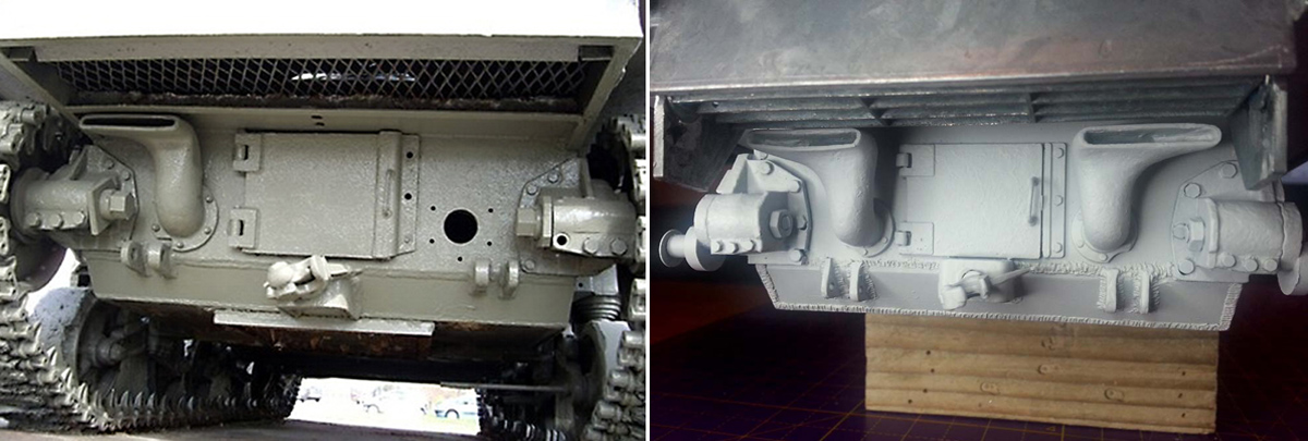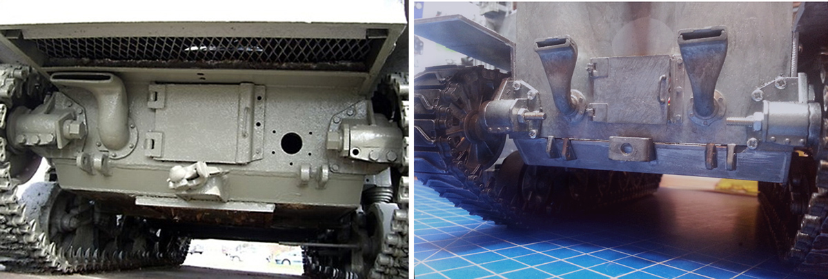 The image on the left (above) is of a welded hull construction (as opposed to cast/riveted) like the Mato so I took this as my template (the detailing is also very clear in this M4A3 example). Mato (right, of course) have done a fair job of approximating the details but there are shortfalls: 1) the exhaust shape is all wrong - too tall, too narrow, 2) the engine access door is too high on hull, notice the gap between the first weld (where the tow lugs are) and the bottom of the door, 3) the clamping bolts in the idler mounts (the three at the bottom of the mount) are barely visible and screws securing the idler assembly to the hull should be bolts too. Also the problem with the door and exhaust height mean the exhaust deflector didn't really work as it should by clearing away from the top of the exhausts and the engine door when in the up position (note that this example of the M4 hull has the deflector removed altogether). Oh dear, this thing this is becoming excessive!