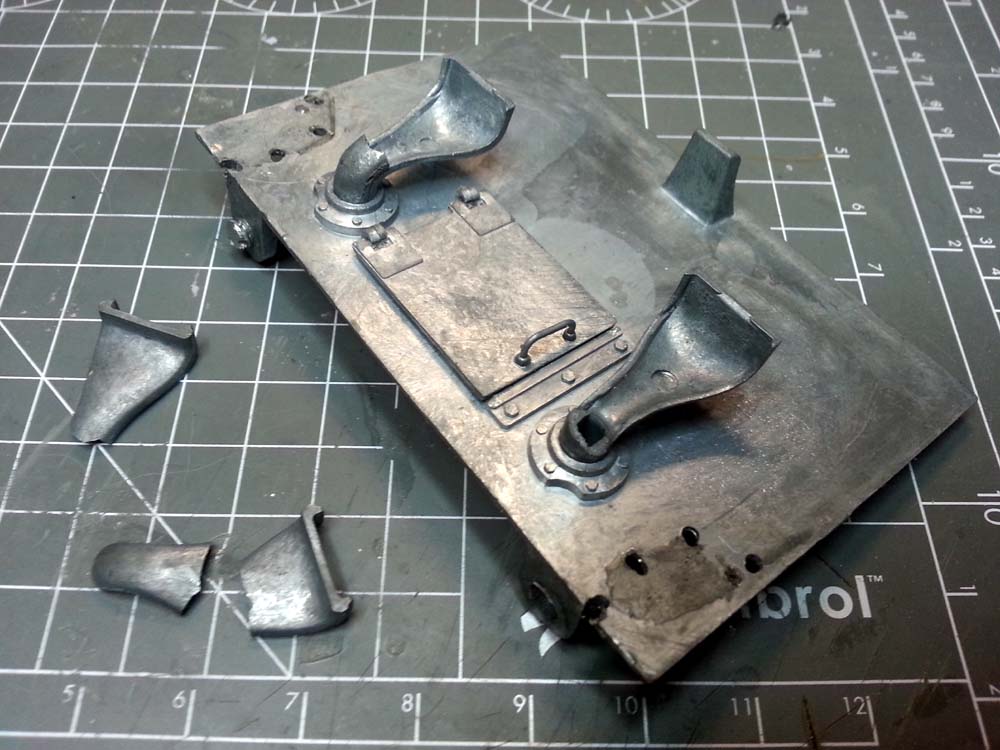 I had to pretty much super heat the exhaust parts to get them out but end the end I managed and went on to start reconstructing them to match the ones in the example above. I also removed the excess material on the bottom of the plate to bring the engine door down to where it should be (notice the indents in the exhaust flanges that are there to clear the tow lugs below). I should add, for others with this Mato, that the rear hull plate and hull itself are made of much better/stronger alloy: