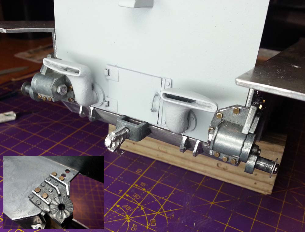 I then refit the rear hull plate to the hull and set about chaging all the screws for brass nuts and bolts (M2.0 on sides which is oversize you will see but these are load-bearing so I thought it better to use stronger fixings here. The rear are M1.6 and M1.4 for the lower clamping bolts). I also added the tow hitch at this stage;