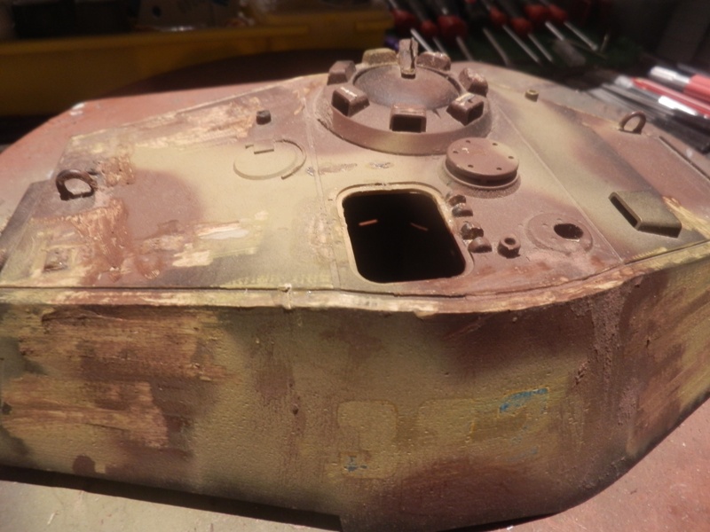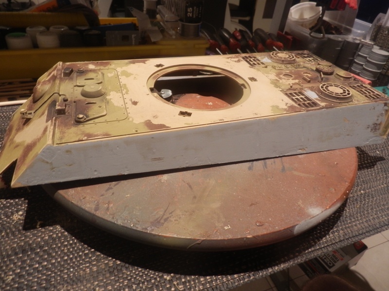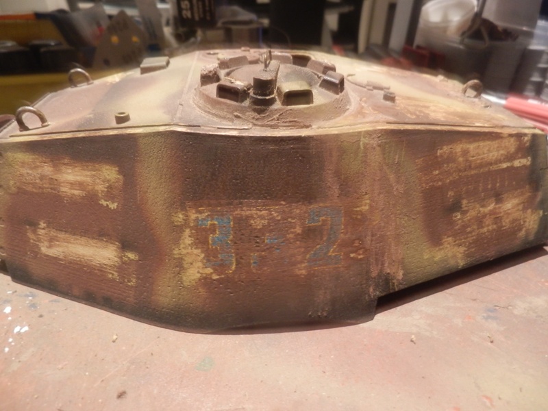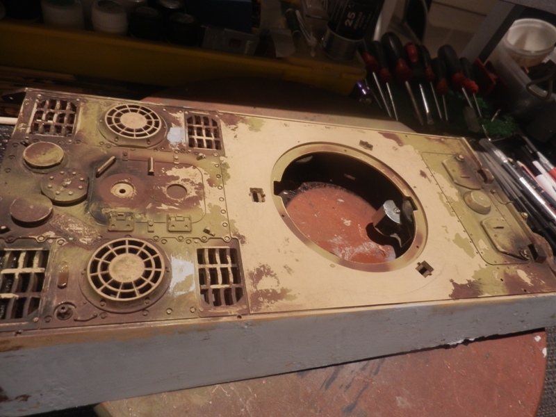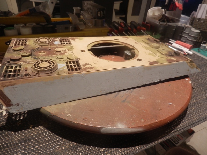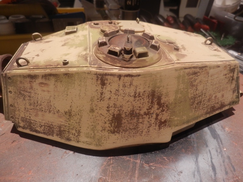 Got the turret clean and ready to place the spare track hangers. Loaders hatch replaced and hinged.