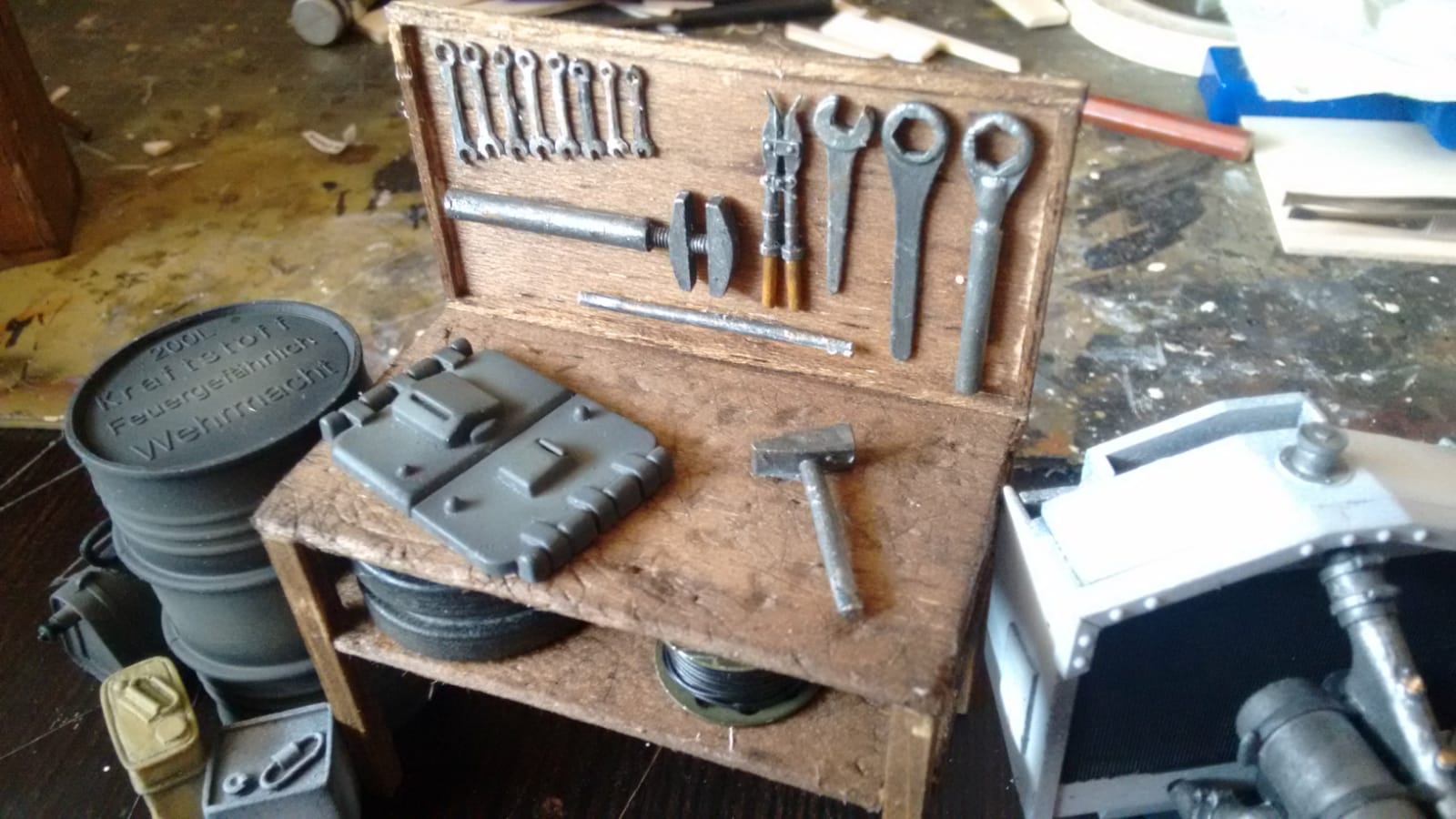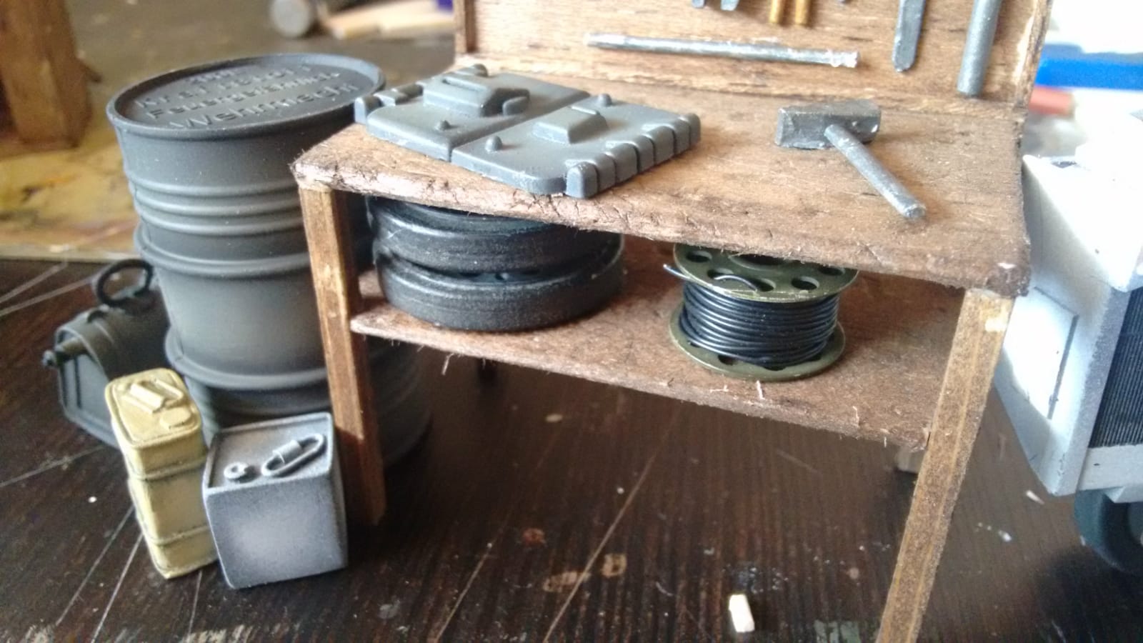 Well, I have all the tanks under deep repairs and maintenance. I am waiting for bearings for the road wheels in all the tanks (Tamiya cheap brass busing are beggining to wear) and also I have all the gearboxes in the U.S. under rework, performed by a Danvile battler. (Fixing the critical design failure they have) So meanwhile all the parts come back to me I started doing some more buildings. I am planning to do a 1:16 scale garage, I will fit inside my Renault FT 17 and the Kubelwagen. I will start the building in a year or so, I have a lot of things open now, lol, but meanwhile I started doing some of the things that I will fit inside.
