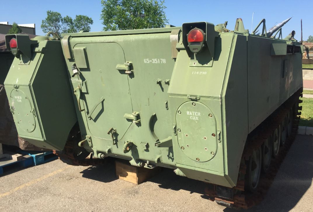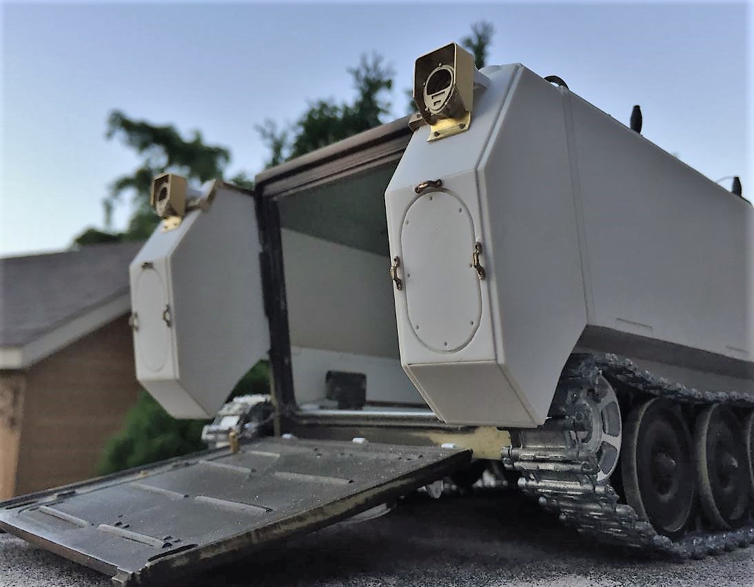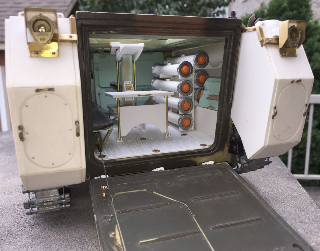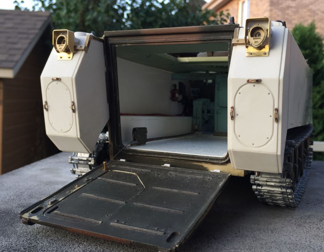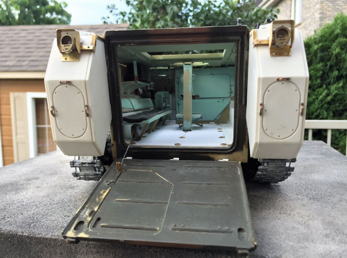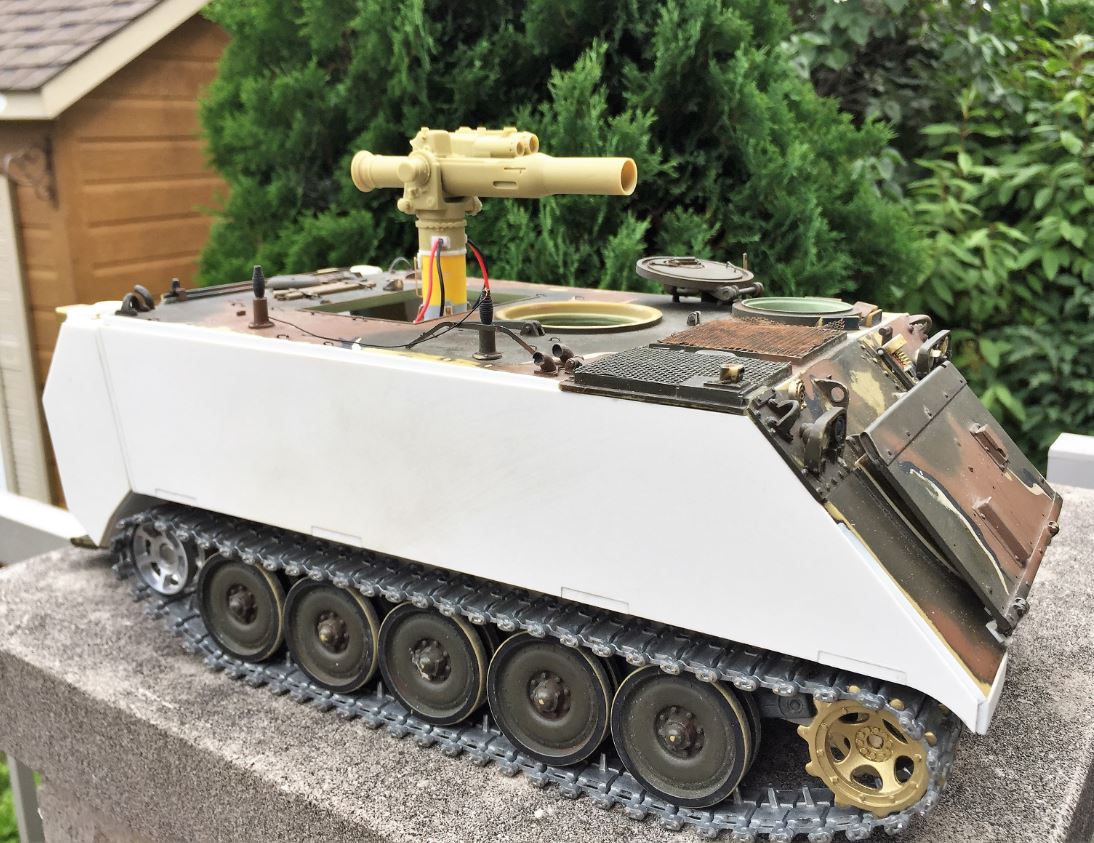 View of the exterior of the M-113A2 with TOW launcher installed, likely a rare sight in 1/16 scale RC, with detailed interior.