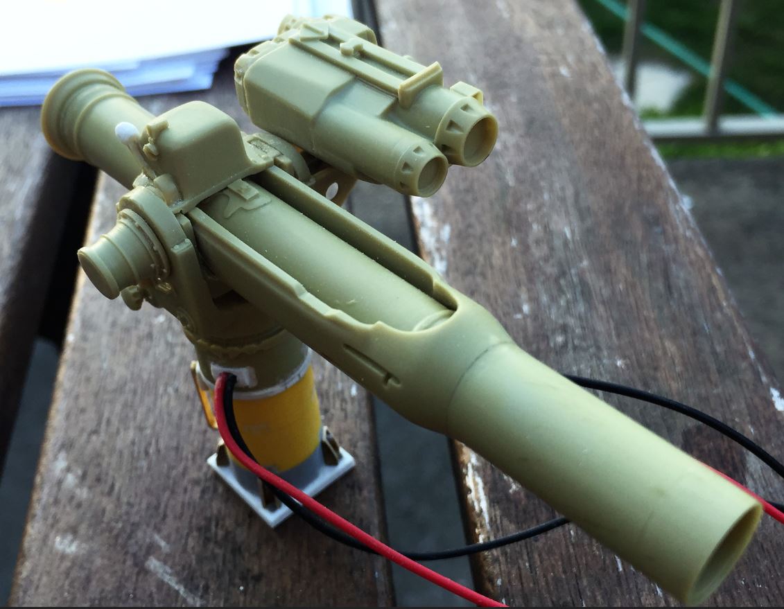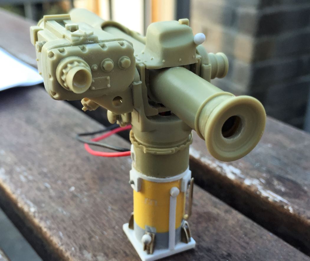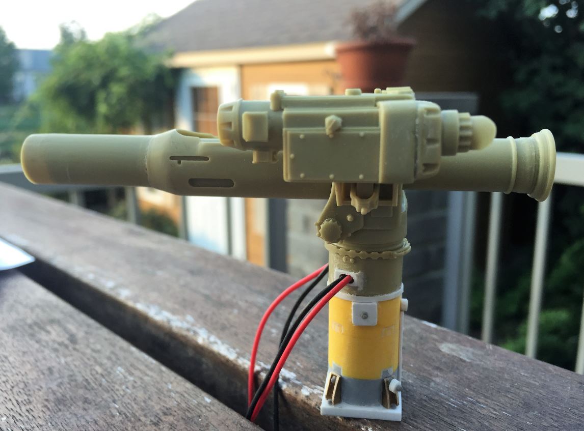 Here is the completed launcher. The missile container and tube were hollowed in order to insert a 5mm LED on both ends. As this is a missile, the back light will represent the missile engine. LED wires will be later positioned around the launcher base to represent the wiring seen on reference. The upper external mount is made of Lego, always useful and a time saver.