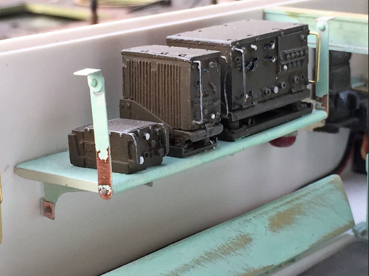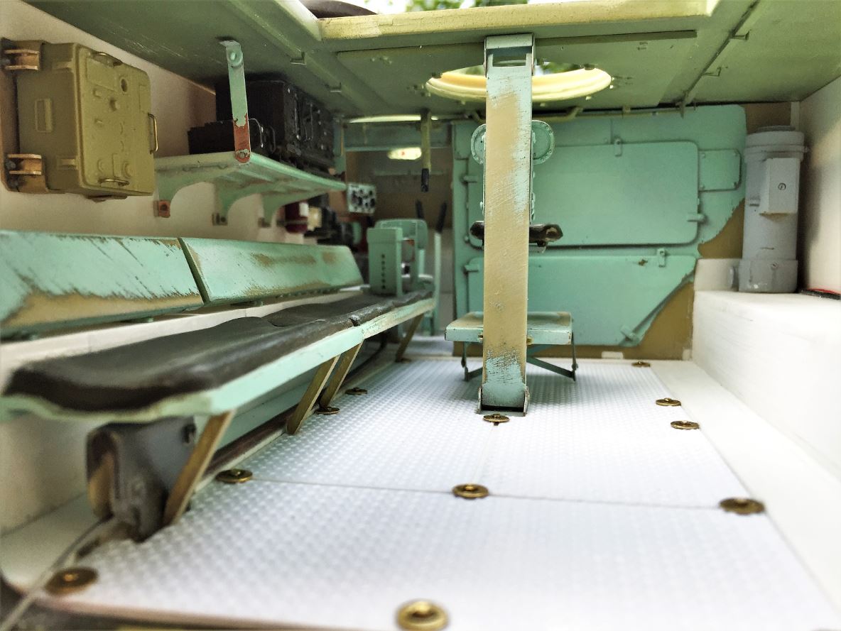 Left side of M113 interior with Verlinden parts installed. As per reference, the TOW missile control box is installed on the left wall on a custom attachment. The rest was put in place in a realistic fashion. As there were over 70,000 M-113 built and many countries did their own modifications for Tow launching, with all kind of variants and modernization efforts, there is really no fixed standard to follow for an M-113 interior.