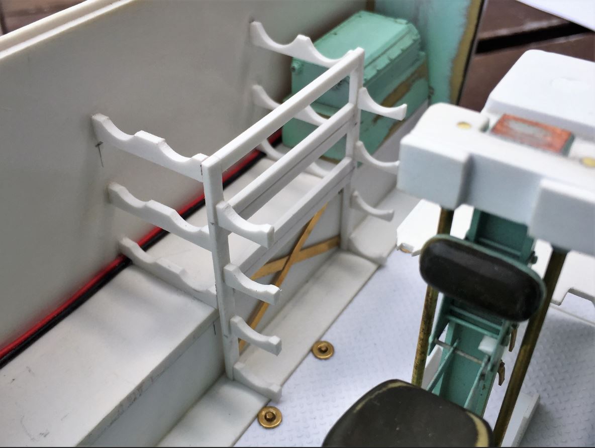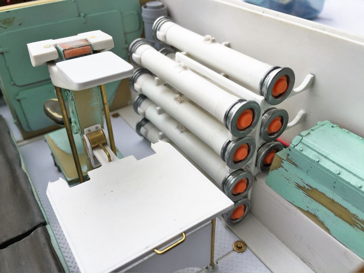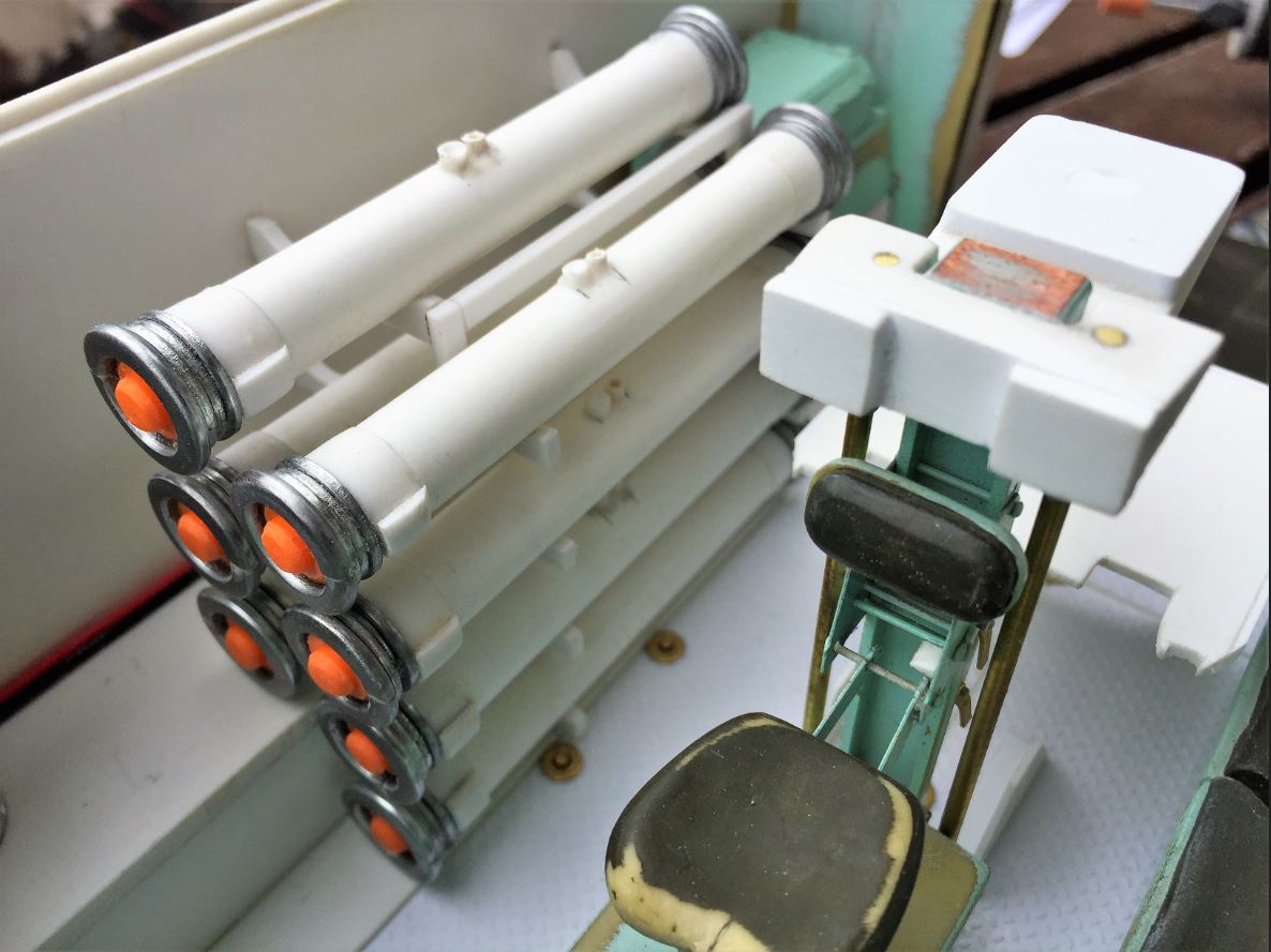 The rack is mostly made of plasticard. It was not easy to create out of nothing. It would have been possible to make it functional with hinges but I kept it simplistic so that I would not spend 2 weeks on it, and it also need to be solid to keep the missile in place so there was little point making it functional. Having the right spacing between missiles is not easy, I can see on the pictures that some adjustments are still required. Need to lower that top shelf a bit.