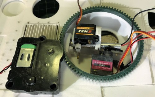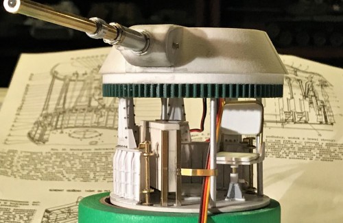 The turret is lowered inside the hull for rotation testing. It works perfectly. I will post a video of the turret in action once all the RC cabling is connected.