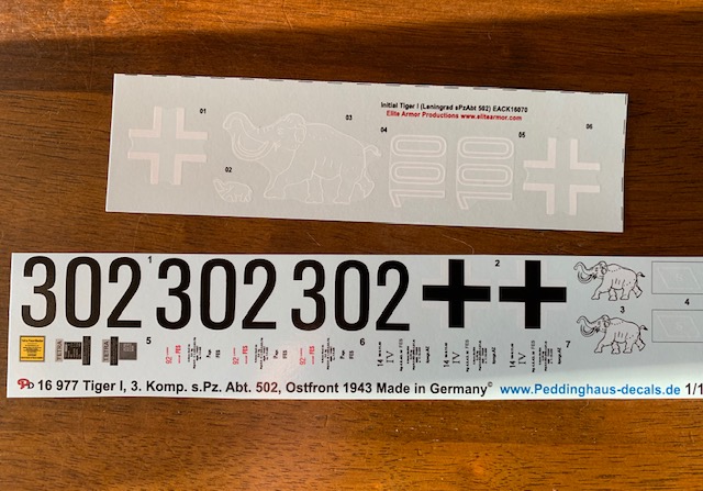 I have a decision to make about which decal set to use. I really like the big Mammoth decal that goes on the rear of the turret but the tank number 100 had side turret cargo boxes and no side skirt armor so it would be very incorrect. I may end end up using the number 302 set. Both tanks are early versions from the 502nd and were at Leningrad which is cool. I’m not sure how most folks feel about modeling inaccurate tank markings.