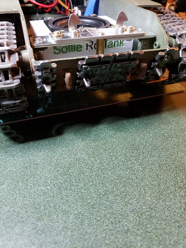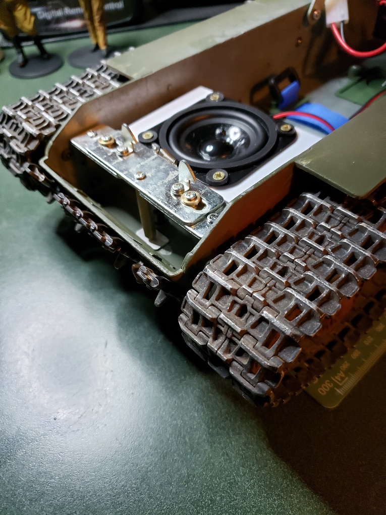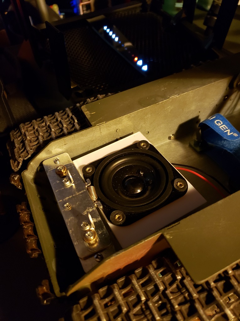 Yesterday, the improved speaker for the tank showed up from Maxmekker in Norway. I installed it last night and the tank sounds can now be described as 'Amazing!' The slightly larger size of the speaker housing has shown the need for a smaller or flatter battery. People I speak to have convinced me that NiMh batteries are going the way of NiCad types when it comes to Hobby applications. I am planning a visit this evening to one of those retail battery Shops to see if I can get a Li-Ion type one made up ( still don't completely trust LiPo batteries ) Pics: (Click to enlarge)