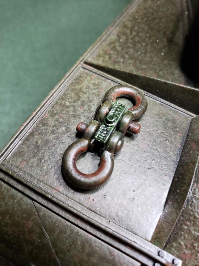 A little more detail work on the lower hull and deck. I still need to find or scratch some micro lenses for the marker lights but they are drilled out and painted inside for a start. Work is ongoing in drilling out the track pin runs for the spares up front. Pics: ( Click to enlarge )