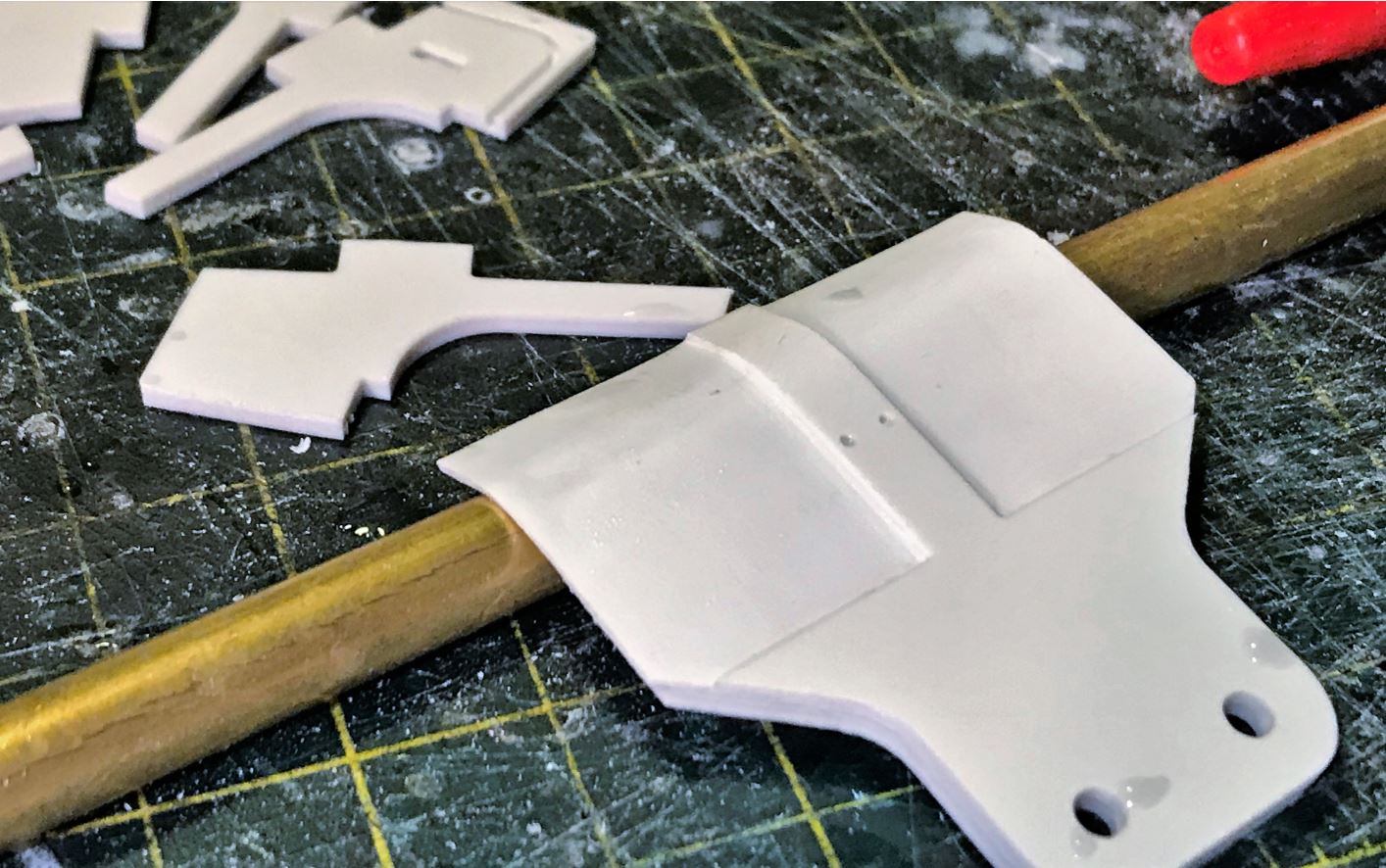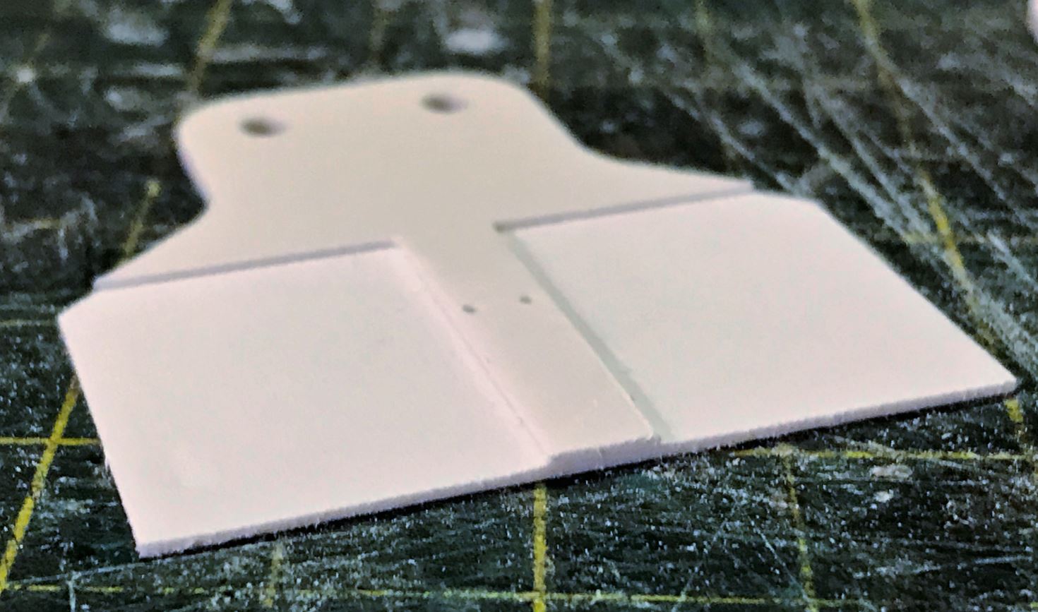 This is the suspension cover part as it should be before rounding the tip as per instructions. Proper preparation and handling of these parts might decide the fate of your build, specially for the first one because you do not have experienced it yet. If this part is too thick, it will not bend easily, will likely crack and will not fit the slot it needs to go into. Do this while you have superglue all over your fingers and things will become ugly real fast. Make it too thin and it will bulge, might also crack because it is too weak, won't look good and won't be solid.