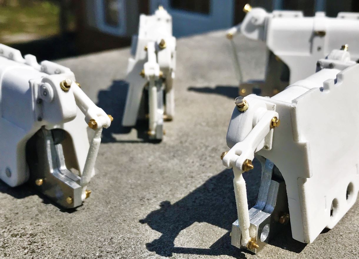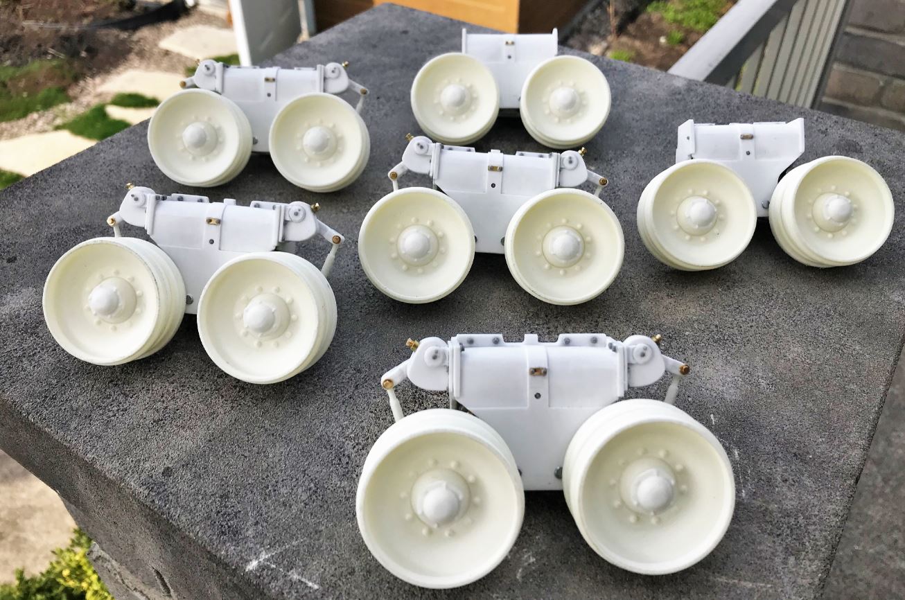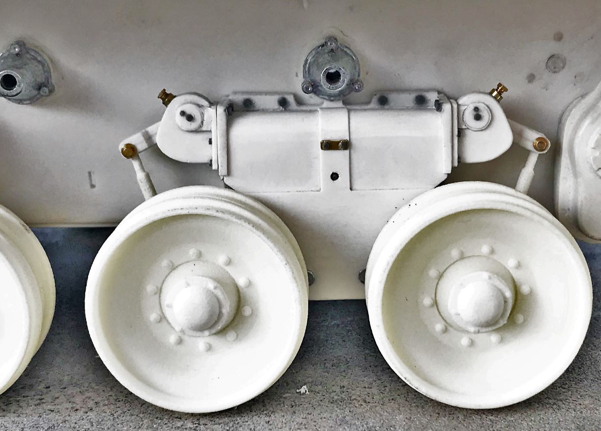 View of the completed suspension units, ready for mounting on the chassis. The rubber rims will be added only after painting.