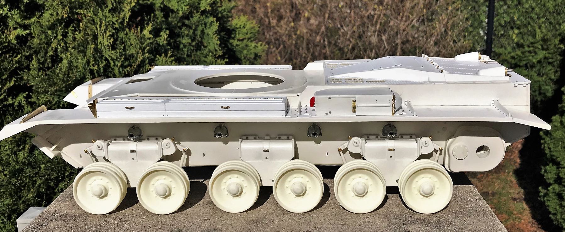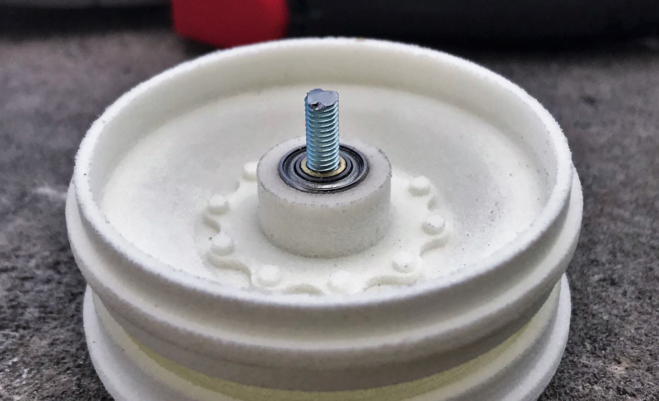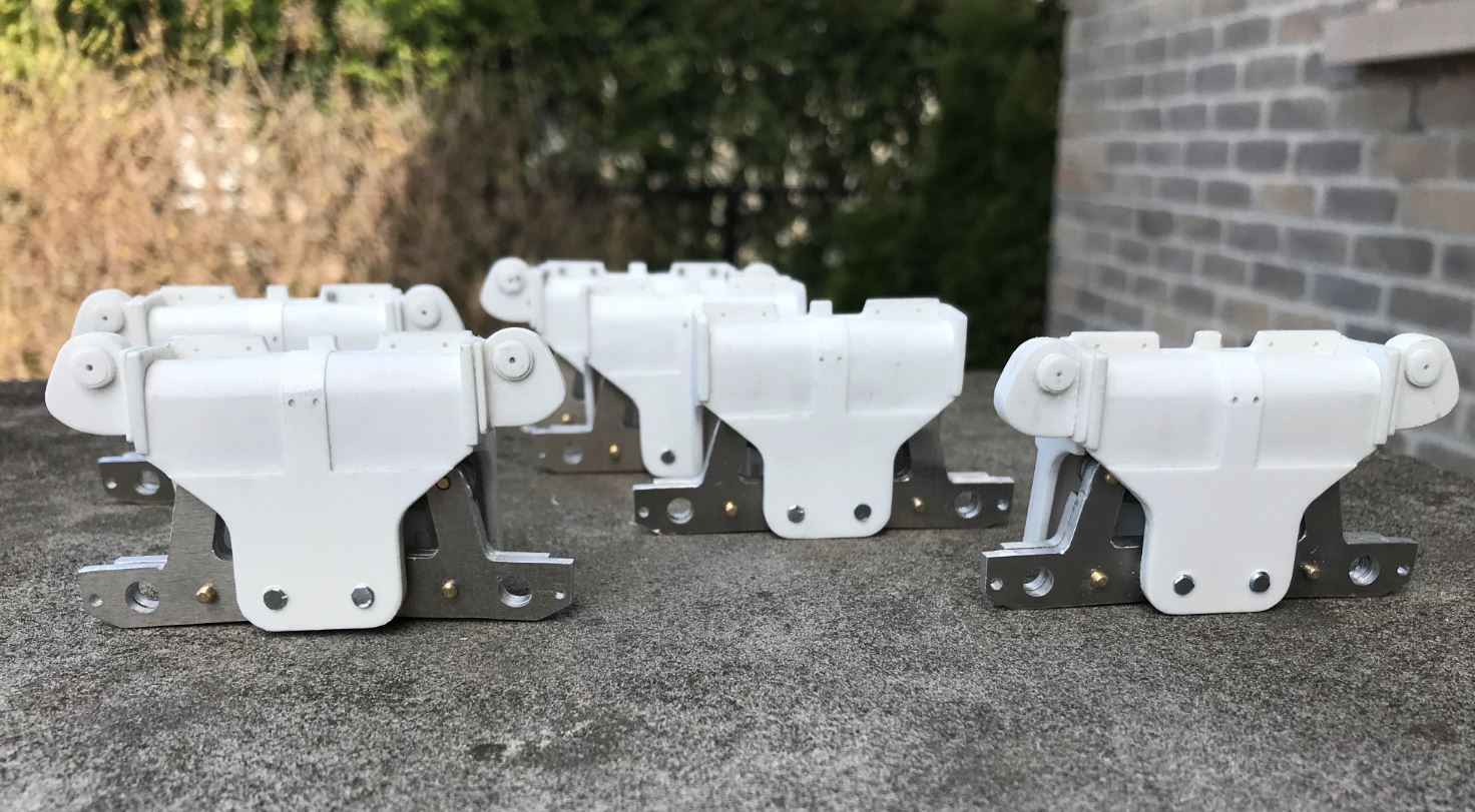 View of the completed suspension units, ready for mounting on the chassis. The rubber rims will be added only after painting.