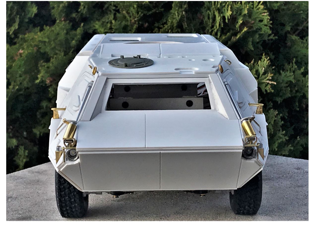 The back of the vehicle so far. The holes for the add-on armor anchor points have been drilled.