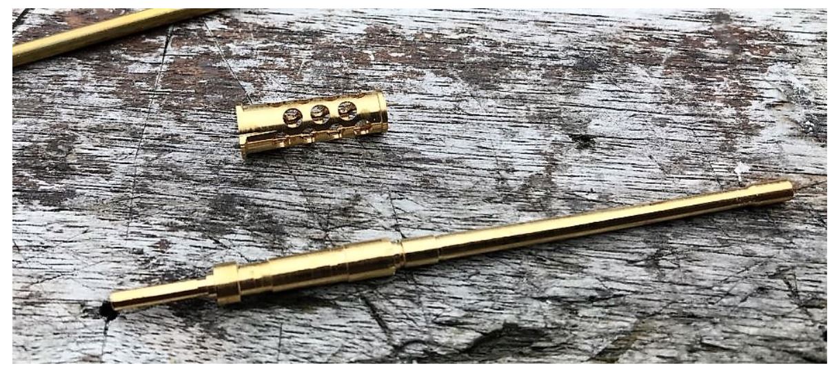 The solid brass barrel is cut at the larger sleeve level, and the sleeve is drilled and made hollow to carry a fibre optic through it.