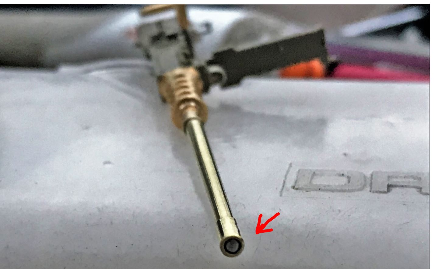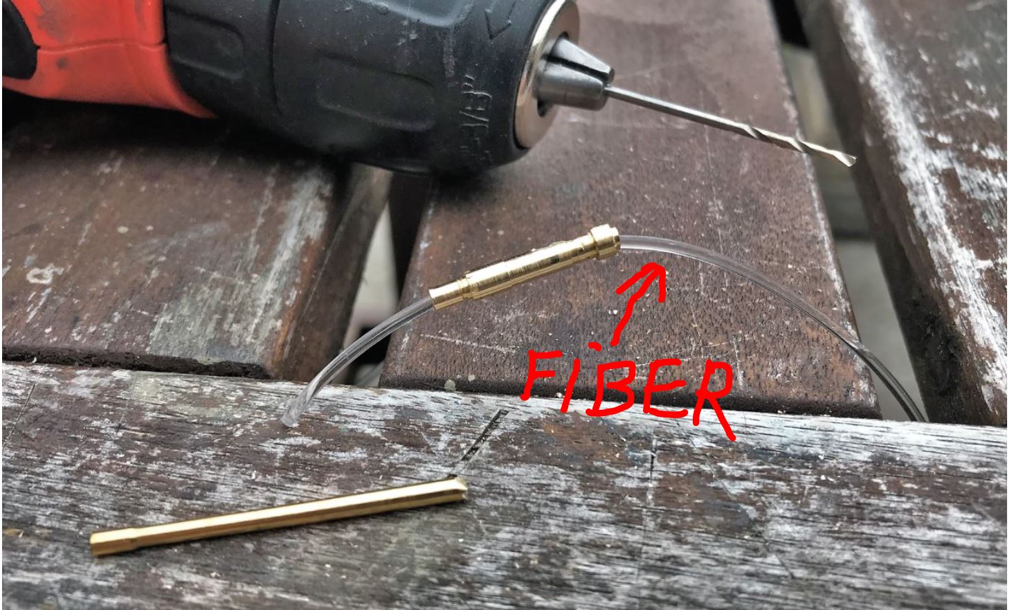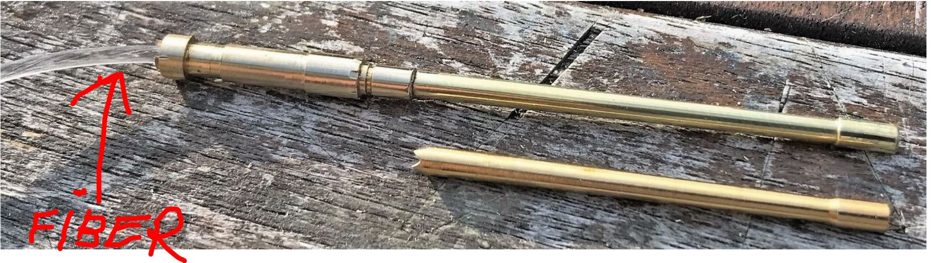 After much hand file sanding to make the tube progressively thinner towards the tip, then polishing and adding a larger muzzle with the same brass tube, the new brass barrel is connected to the sleeve area with the fibre optic running through it.