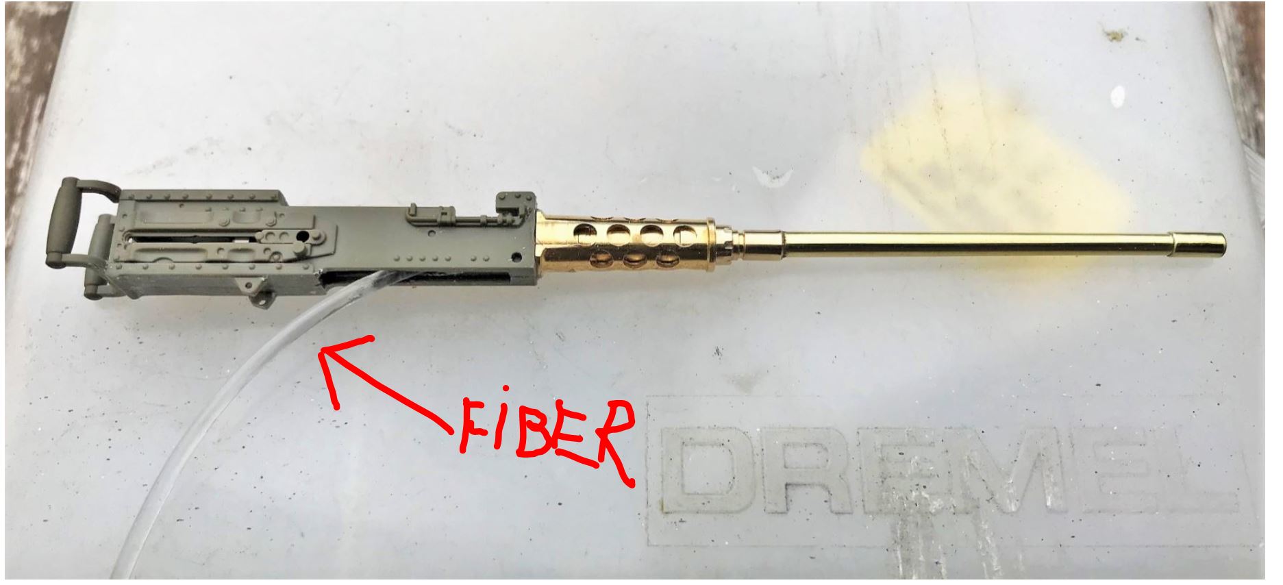 As the TC machine gun is well protected behind a gun shield, the plan is for the fibre optic to go down through the MG mount and then inside the turret where a LED will be connected. The fibre should be well hidden.
