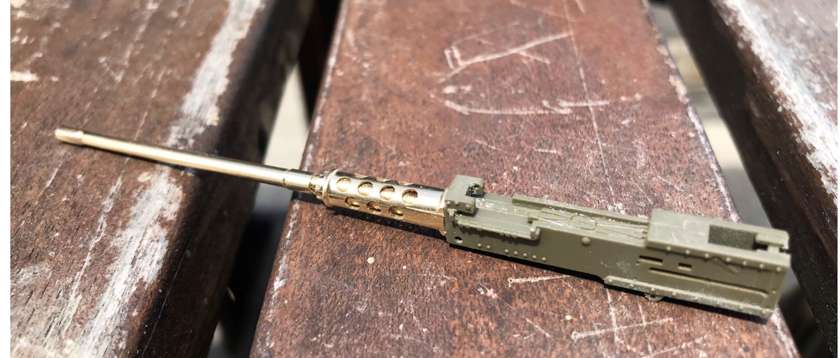 This is the Aber M2 brass barrel, getting ready to be cut, drilled and modified. It is not obvious to do. I did it once for the cupola MG on the M48 build but this time, it is for a complete standalone M2 on its external mount.