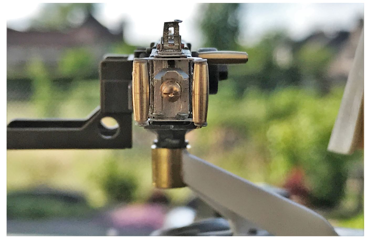 That little roundel on top right of the rear sight is the adjustment wheel. Its real tiny. There are 2 very small PE strip 1mm long that are supposed to be positioned in the slots under the trigger. One of these tiny part flipped in the air and I never saw it again, lost forever. So I skipped that step, for now. You can notice the fibre optic of the machine gun flash going down inside the turret.