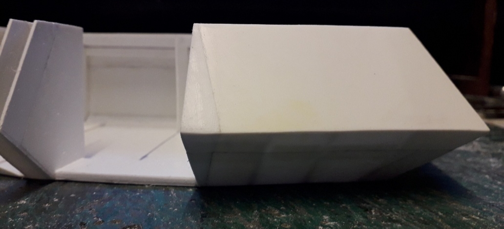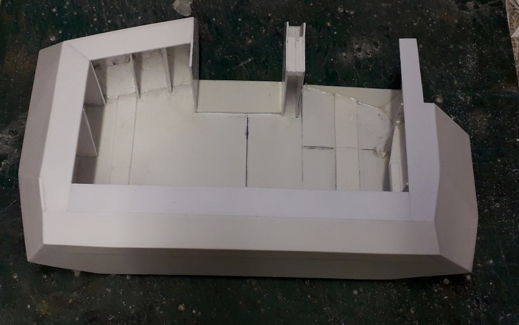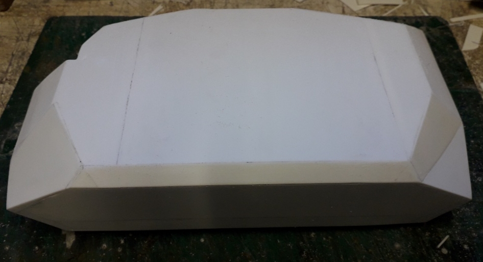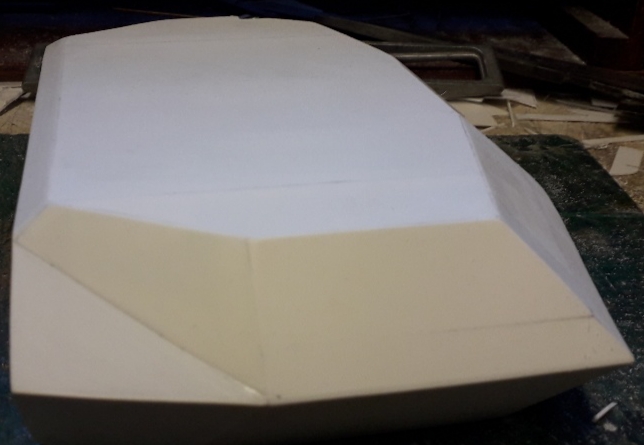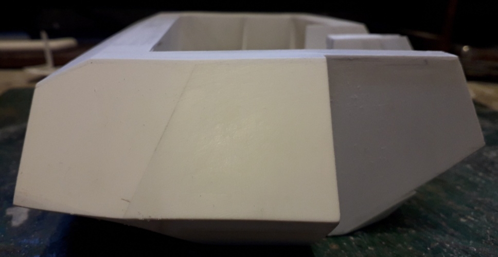 Its just the basic lower shape still in its raw state, which requires cleaning up, the odd bit of filler here and there but it shows the many angled surfaces which make up the turret shape, i still have to add the gun optics mount which will go in the cut out on the right side, the angled frontal side cover which goes over where the auto cannon side ejects the spent shell casings and all the upper turret roof, hatches etc etc.