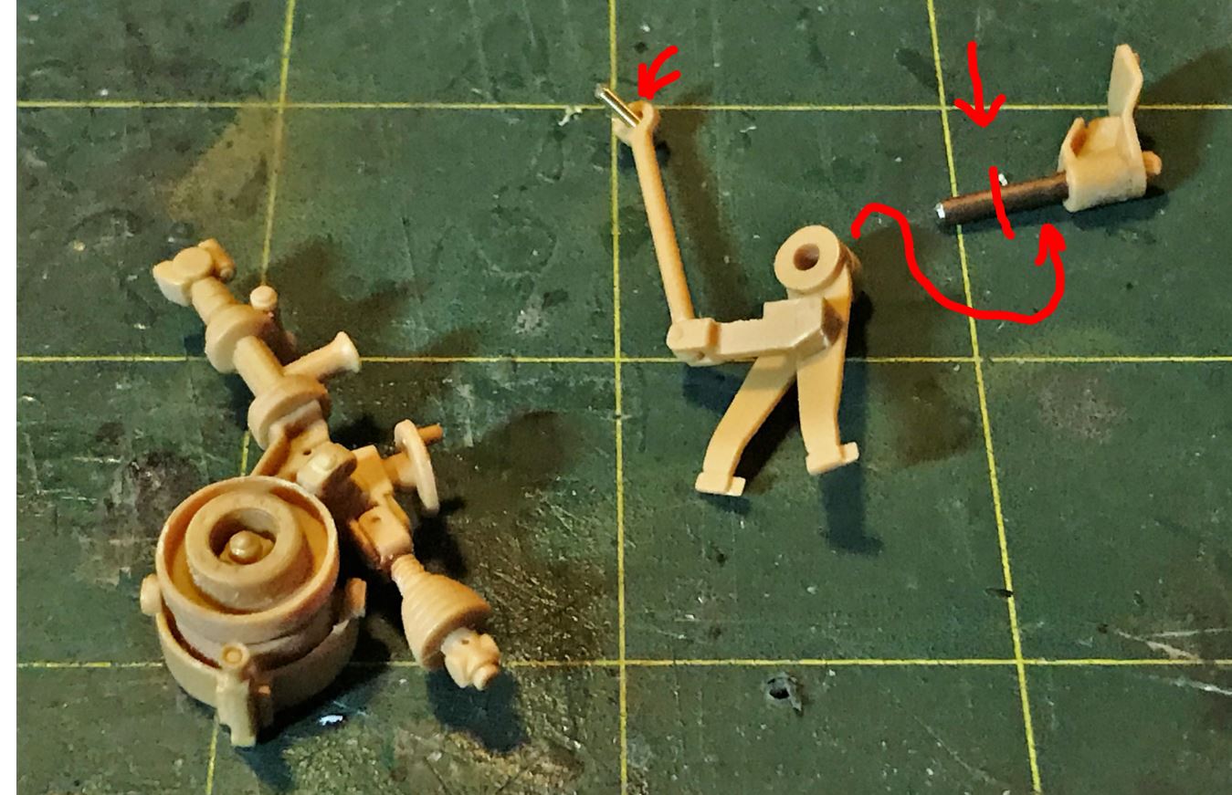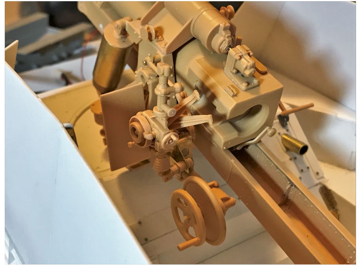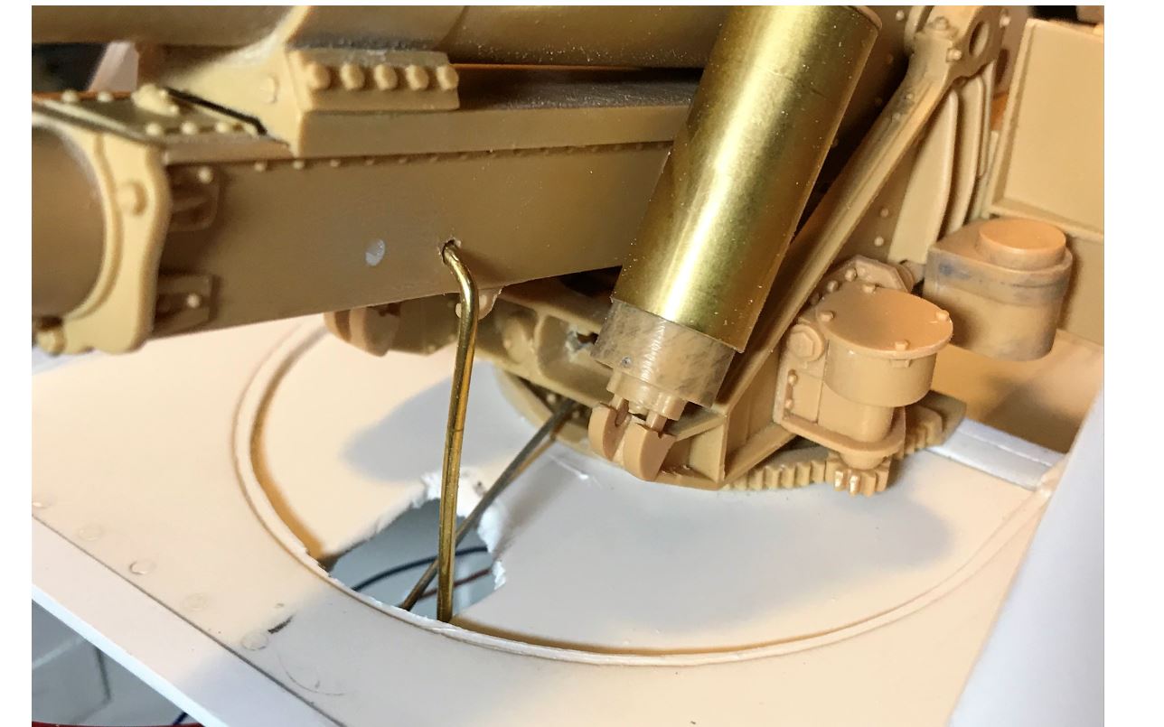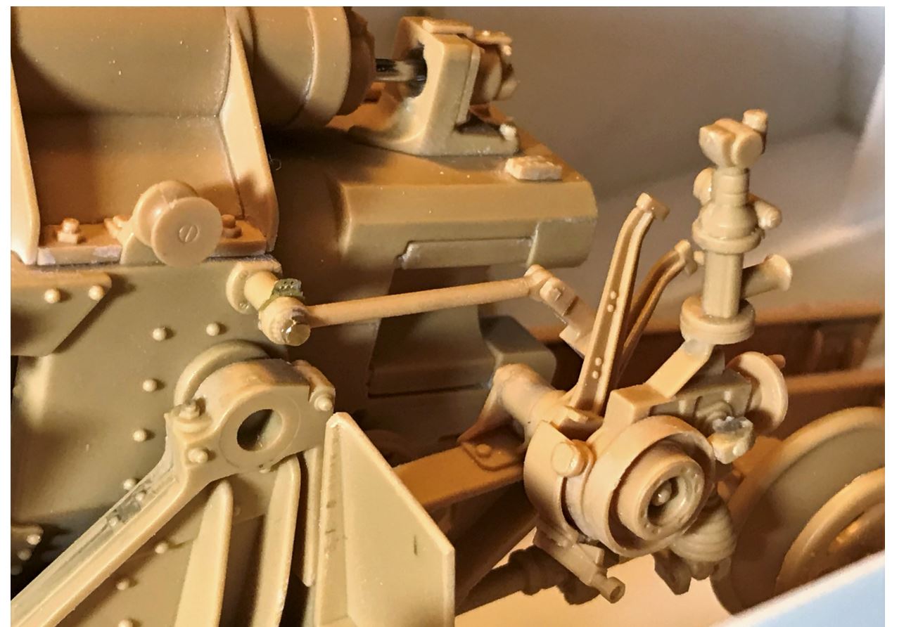 The gunsight kit parts are very accurate and finely molded but their design do not allow for gun elevation movement, which is surprising. I had to replace the main plastic shaft by a brass rod to which the bracket connecting to the gun mount can swivel. An M1.2 bolt is used for the other end connector. The gun sight itself was glued to the shaft and stays fixed.