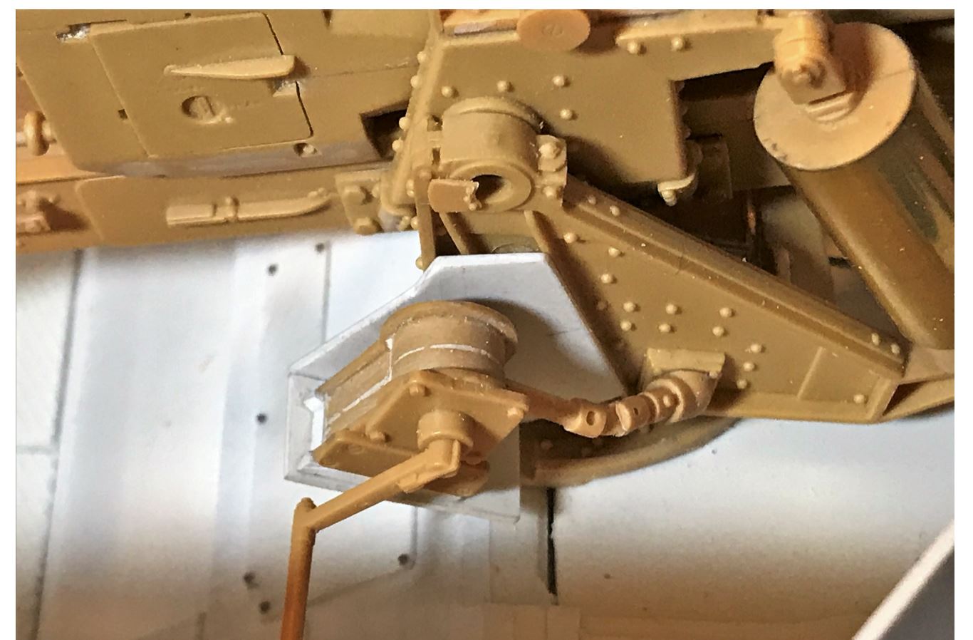 I had some difficulty determining the size of the bracket. The size extrapolated from the Dragon kit was not a good match for the size of the Merit 1/16 crank mechanism. It might be a bit underscale. I beefed it up a bit.