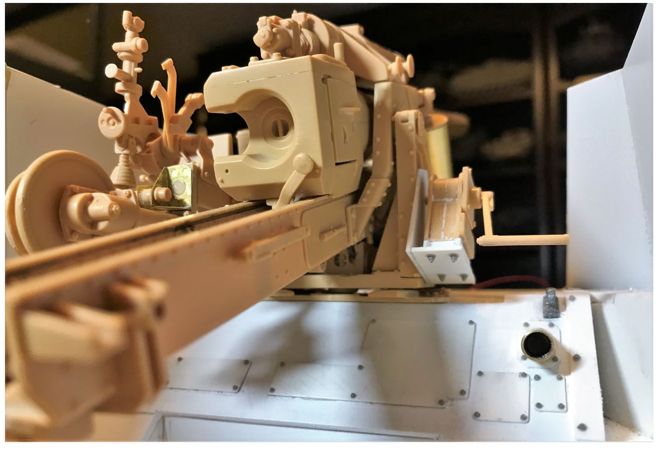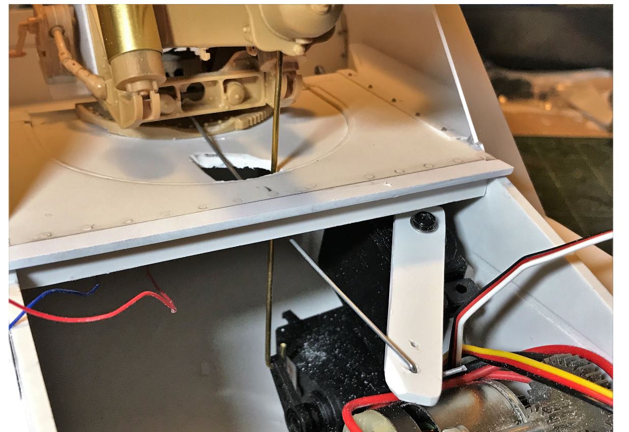 Gun elevation is activated by a push rod connected to a large servo inside the hull, and sharing the hole of the recoil mechanism. It will be hidden behind the gun shield.