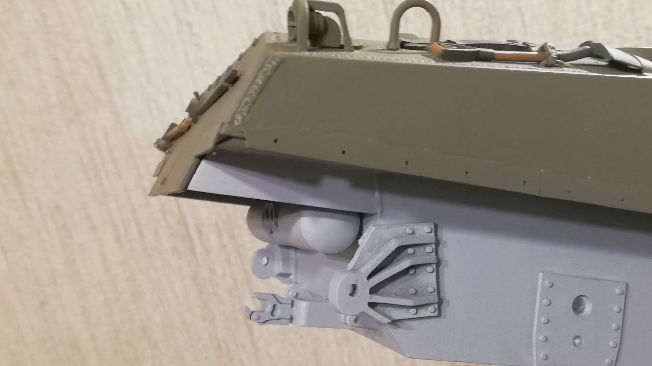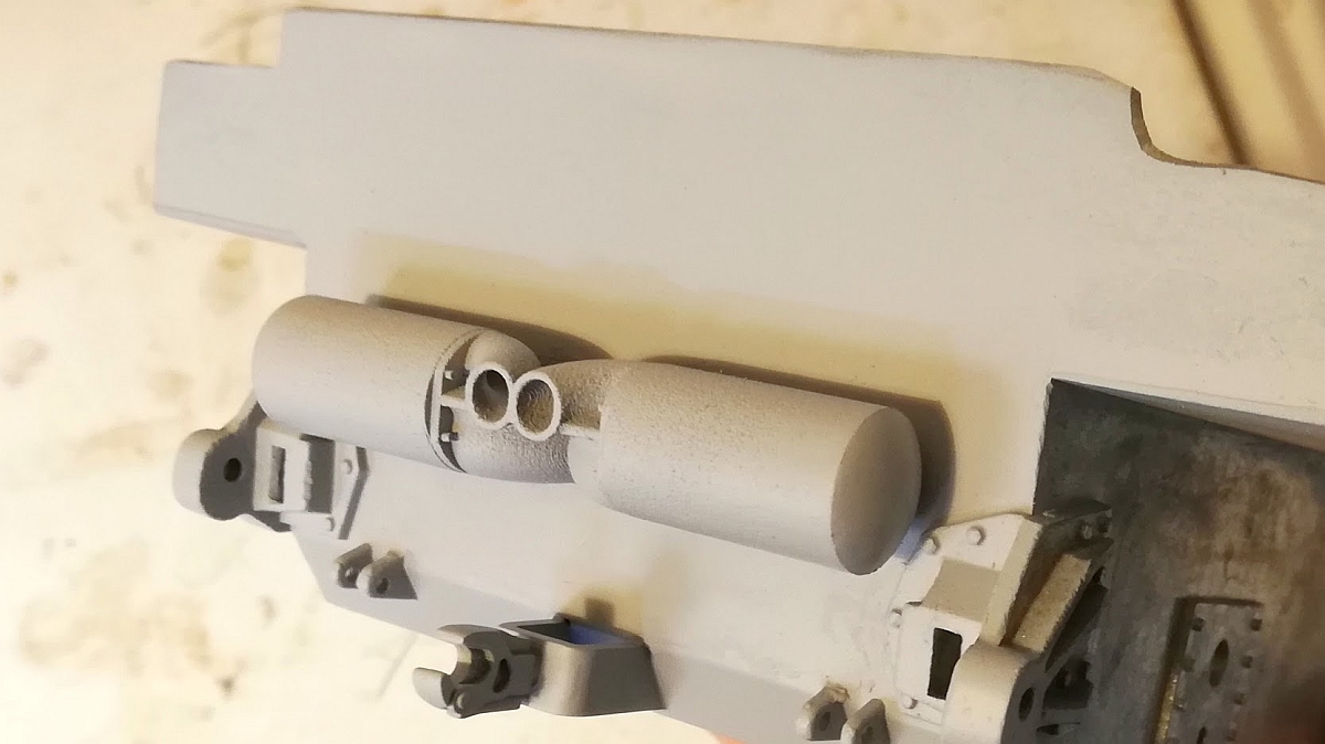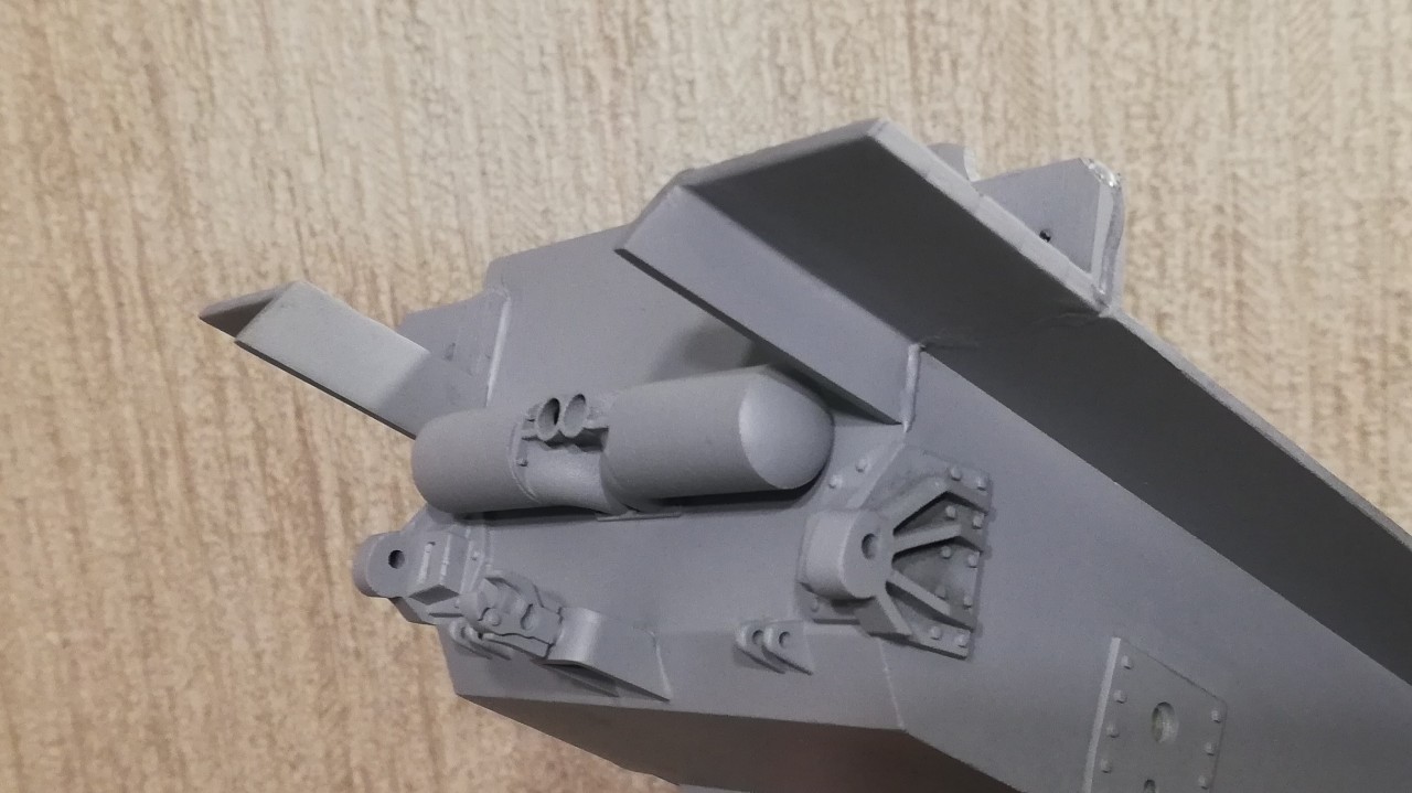 Meanwhile I sanded off all details in the back side of the hull as M4A2 had different exhaust than M4A3. Muffler will be ordered from Shapeways - I couldn't draw this complicated tangle of pipes: