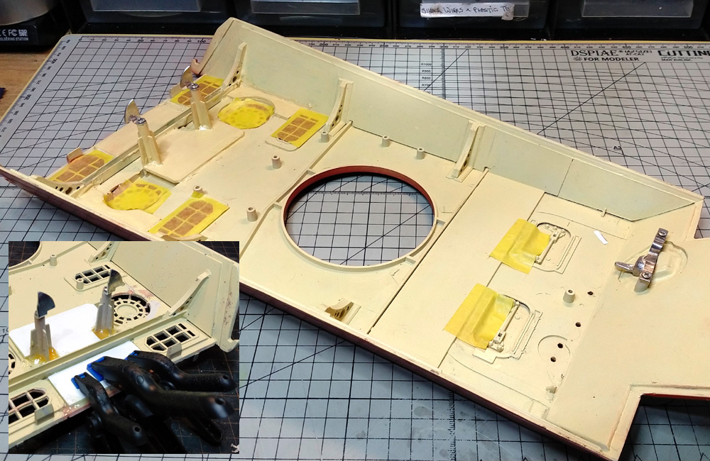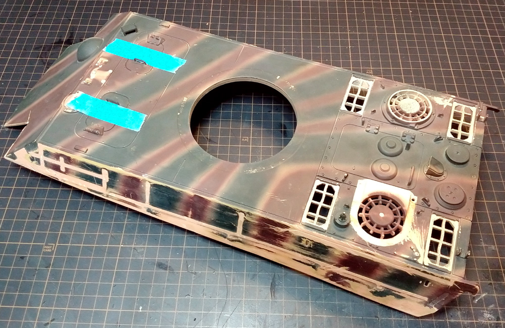 Turning attention, then, to the rear of the upper hull first the initial step was of course to strip it back to a bare plate ready to take the various upgrade parts, some of which are necessary for No.122 and others just desirable;