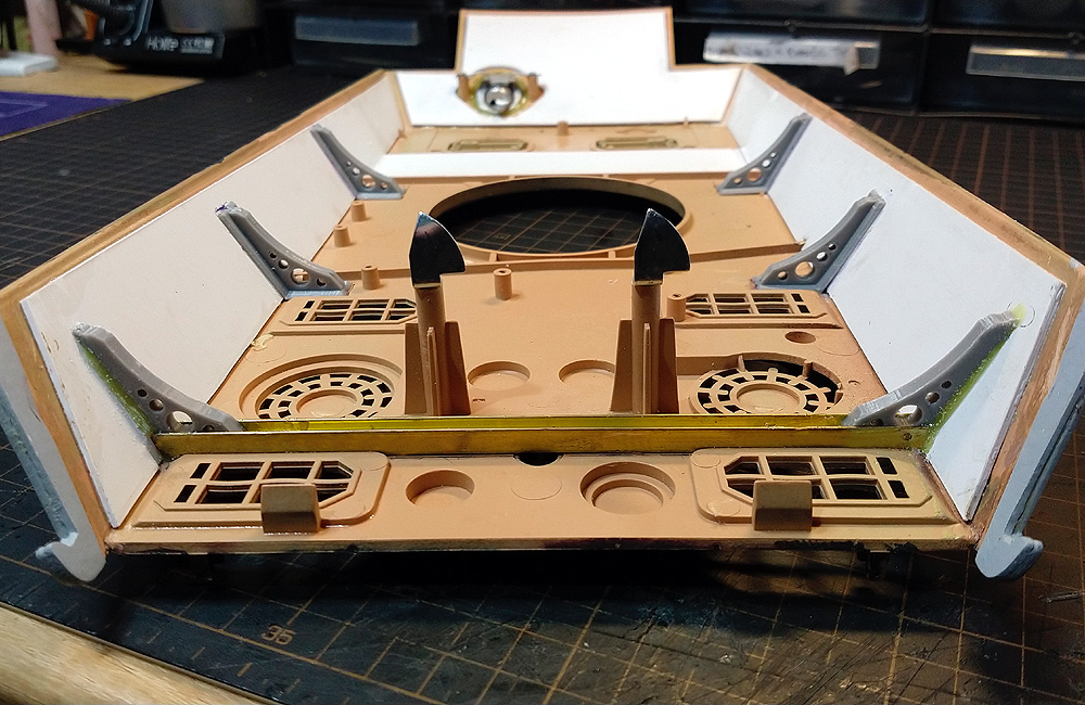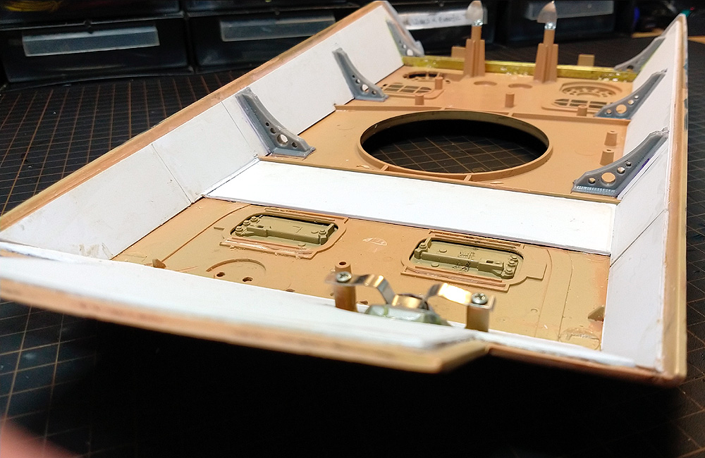 Before moving to the detail of the upper hull I wanted to strengthen it somewhat as it is quite flimsy and the extra weight of various planned upgrades was likely to put further stress on the structure. In truth it would probably be OK but to be sure I introducing bracing across the hull as well as adding polystyrene reinforcement. In addition I Added angled braces to the side armour which I designed and 3D printed. These were set at the correct angle for the sides of the hull and would correct a problem I had with this tank having a gap along the rear edge of the side plates (pointed to earlier in this thread);