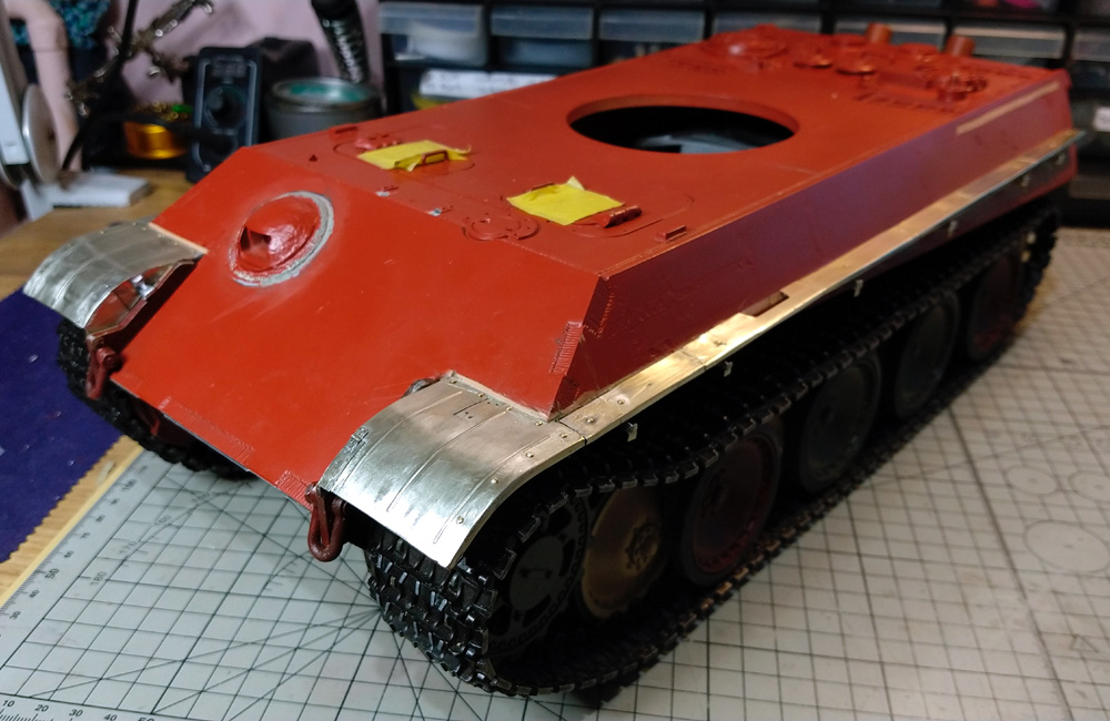 Following this I started on the photo-etched fenders. These were pretty tricky to get right. I had laboured over whether or not to upgrade the fenders with the photo-etched stuff at all as, given this was to be a working RC tank, it wasn't clear the thin brass fenders would be adequate to the job, even though they looked so much better. To be honest I was persuaded of pushing ahead with the fender upgrade when following Herman Bix's build thread on his Panther No.111 and decided to do likewise in terms of heavily supporting the undersides with a liberal portion of epoxy resin, etc;