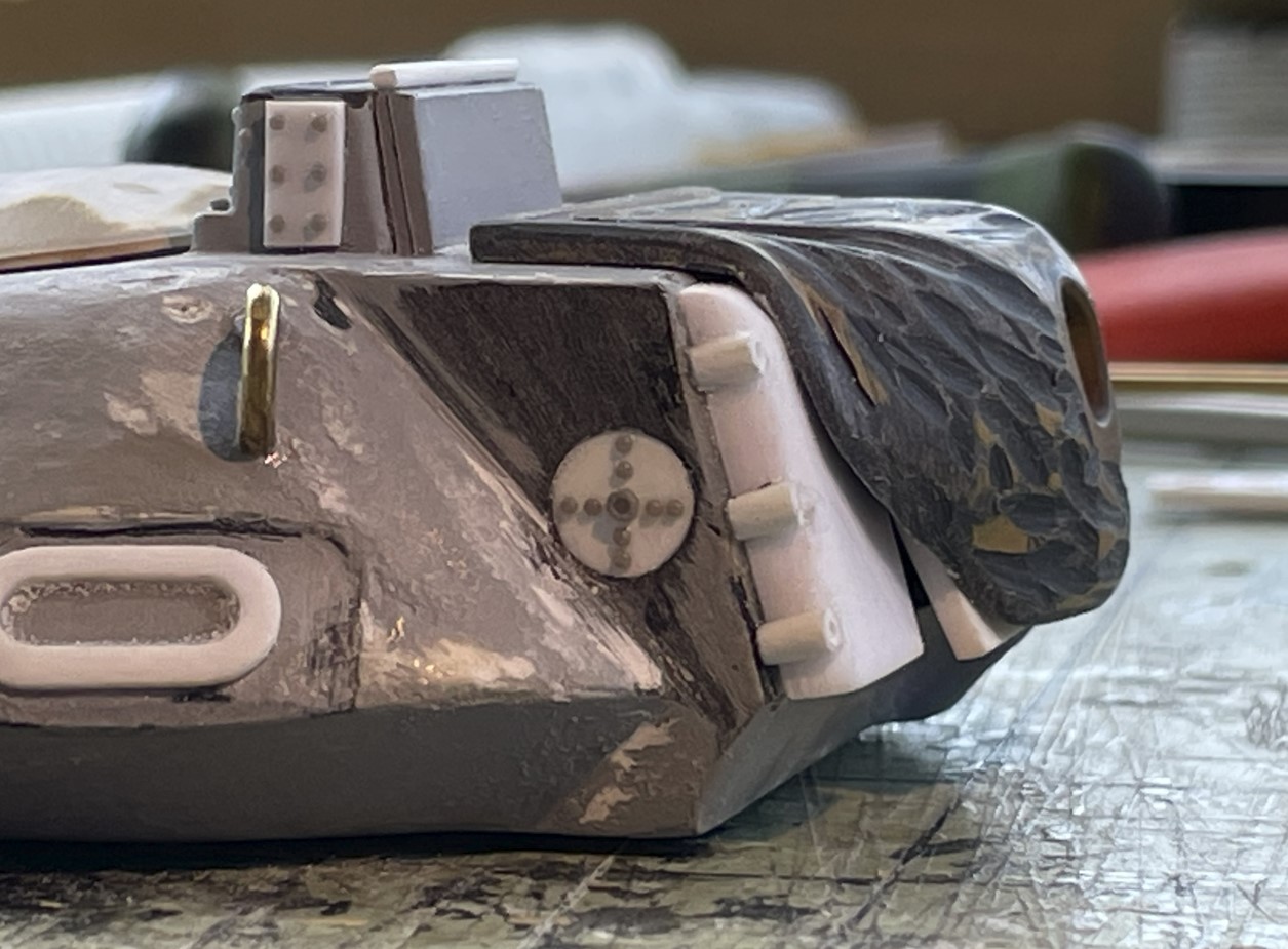 I could replace this vent but it would likely damage the turret while doing so. I decided to only improve the top, showing embedded bolts instead of raised bolt heads, as seen in reference picture.