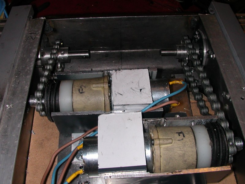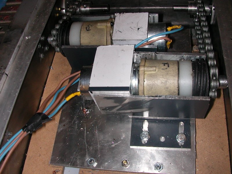 Before we got there we had to somehow hold the stripped battery drill motor so I made an aluminium cradle whilst Frank made the pulleys to go onto the end of the drill motor.We assemble it all together, applied the power and NOTHING......AAARRRGGGGHHHH. nothing but a slipping belt !!. Plan 74a next......W decided to try use a cog and chain method but after researching ebay we couldn't locate cogs that were small enough.....Plan 75a....Only way forward was to make our own cogs and that was something we had never done...However with some aluminium bar, some very precise measurments and some trial and error we are now quite proud of our cogs. Next problem was how to get the chain to exactly the right tension so we drilled elongelated holes in the base plates so that we could move the motor mounts backwards and forwards.We had mounted all this onto some MDF boarding but found this far too flexible so then made aluminium base plate but still too much movement so then another strip down and plenty of wood packing underneath all the boarding. Finally we assembled it all again and connected the electrics and the battery......SUCCESS...it moved beautifully forwards and backwood and sounded great with the metal treads on a metal table.....The electrics need a lot of work as can be seen in the photo but we are going to use a servo for applying power to the motor but we need to find some electric device that will reverse the + and - so that the motors will go into reverse. Any ideas anyone