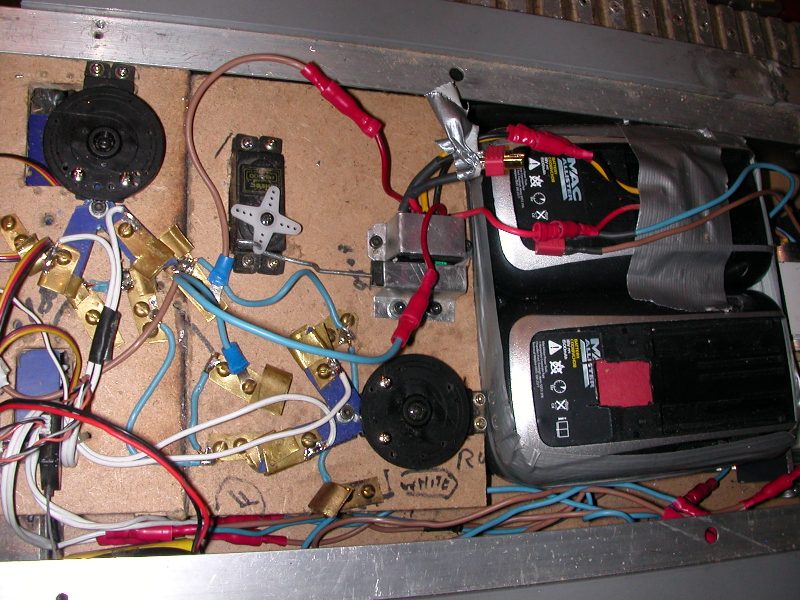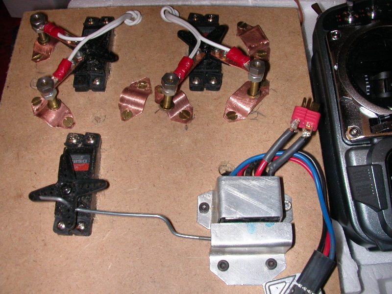 and therefore burn out the electrics. Luckily we had a spare so back to the workshop for a rethink. The idea worked but we had to neaten it up. See next lot of photos for the almost finished board. Instead of top wiring all wire run under the board. The first copper connection on each servo is positive with the other arm being on negative. When the switch is operated the arms move and the positive arm moves to the negative and the negative arm moves to the positive thus reversing the motors.Hence forward and reverse.......