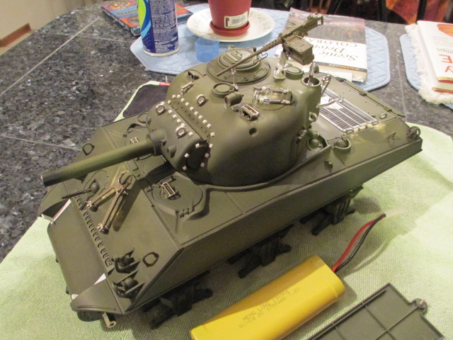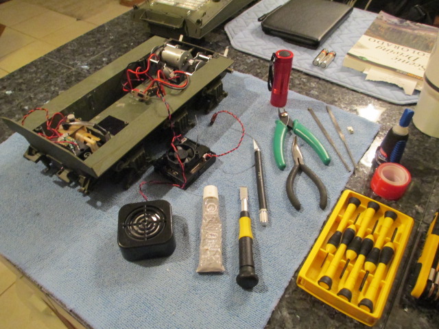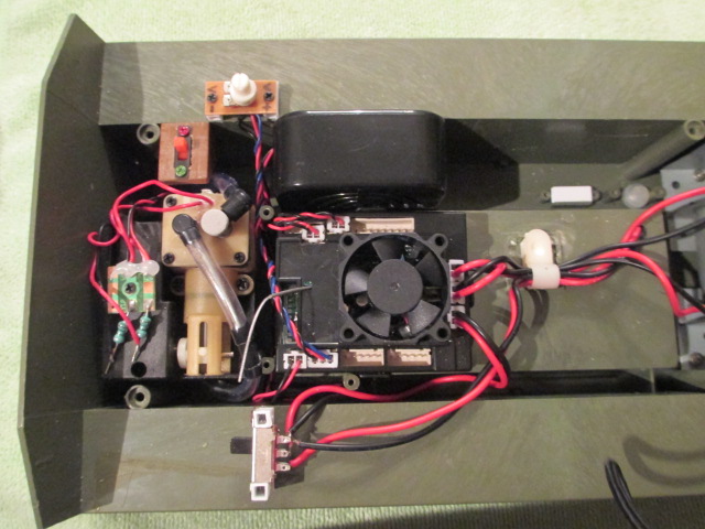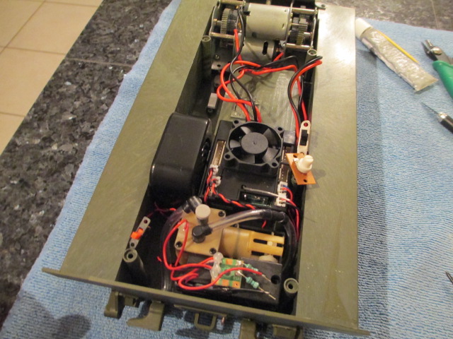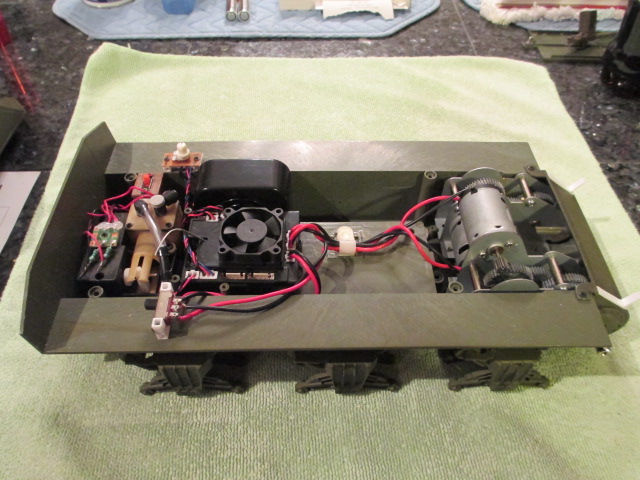 48th Day: Pretty much finished the Electronics tonight. All that remains is to mount the switches and wire tie the wires back into a semblance of neatness. As Scalawag had warned, space is at a Premium inside a Sherman's hull, at least if you leave the battery box in and plan on using your airgun. I found myself removing a piece of plastistruct I had put on the sidewall the night before to cover an old switch mount and also removing a four inch length of the interior battery box step out where it is molded into the lower hull. Both sections were replaced by thin brass glued into place. This was necessary to allow plenty of room for the new Taigen speaker enclosure to slide all the way to the bottom of the lower hull on the side and clear the turret rotation box mounted under the top of the upper hull. The speaker was mounted with clear, removable double sided tape on the bottom of the enclosure which left a quarter of an inch of clearance. After the speaker placement was figured out, the RX-18 with the fan slid neatly to the rear and was mounted on the top of the battery box beside the smoker with the same type of adhesive tape. It is now well out of the way of the airgun mechanism's rotation and elevation\depression paths. Pictures:
