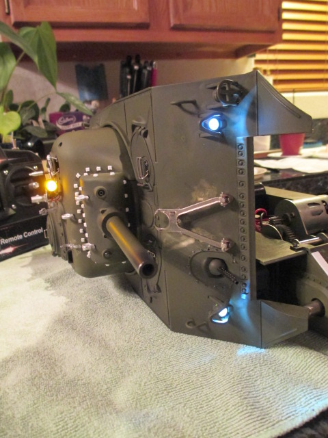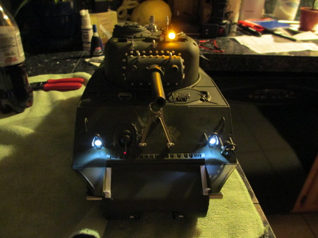 50th Day: After all of last night's work, I started out by plugging in everything on the upper hull and trying it out. It all worked great and the main gun at max elevation cleared everything inside. Next, I tested the thing that has given me the most goosebumps, the searchlight. It 'had' a 'grain of rice' led headlight bulb in it from a headlight kit I got for my Panther build. I say 'had' because I wound the contacts around the hot and ground on a headlight and switched the tank on. I got an odd behavior which consisted of the headlights flashing as normal then the searchlight flashing and back and forth. ( the headlights would flash then the searchlight would flash ) I think this may have been because the battery was low. I started the tank up using the controller to see if all three bulbs would light. The headlights did but I heard a loud pop up on the turret and quickly shut everything down. I removed the led from the back of the searchlight housing and yep, it and the red wire were fried. I'll go to Hobbytown tomorrow and see if they have a slighter stronger bulb and actually solder it on. I'll use a fully charged battery and see if that fixes the weird and intermittent flashing issue. Pictures: