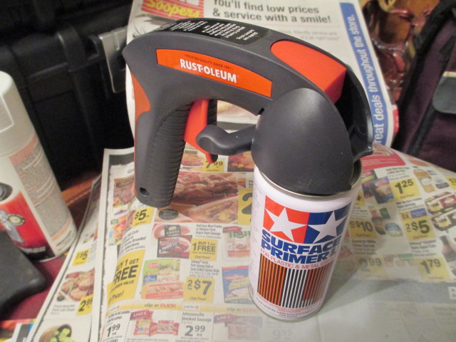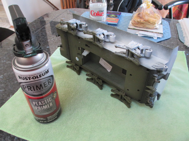 54th Day: Cody, thank you for the kind words, Sir. The Mate tells me often that "if you don't quit fiddling with it you're going to break it (again) As an example, on the searchlight LED contacts, I have rubber cement coated the hot lead and then painted it and the ground and as an extra (and hopefully final) touch today, put a couple of drops of the Ultra Gel cement I use on the point where the wire is soldered to the LED contacts to stiffen them against breakage. Inside the turret, I ran a length of heat shrink tubing to protect the thin wires up to the LED from the turret and air gun gearing when the turret is being used. Hopefully that is enough protection for now. Later, I may replace the searchlight with an articulated one that will use the grain of rice LED. If I do so, I will make mounting points for the LED wiring and attach it to the inside of the turret, safely out of the way. Today, I got my rattle can trigger grip out of the garage and tested the Rustoleum plastic primer I had purchased. I hit the area on the lower hull where I had filled the switch opening with putty and saw that one pass resulted in one coat smoothly covering it. What that tells me is that this primer will be unsuitable for the rest of the tank. It seals as well as primes so it will run to fill depressions then level itself out while drying. A lot of detail would be lost and on complicated surfaces like the rear deck and turret and this feature would produce an uneven primer coat. I will go down to Hobbytown or Hobby Lobby this Saturday and get the right hobby grade flat primer for enamel. Pictures: