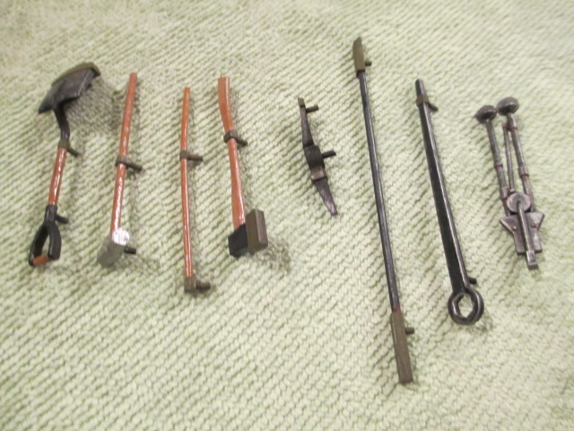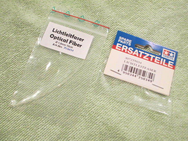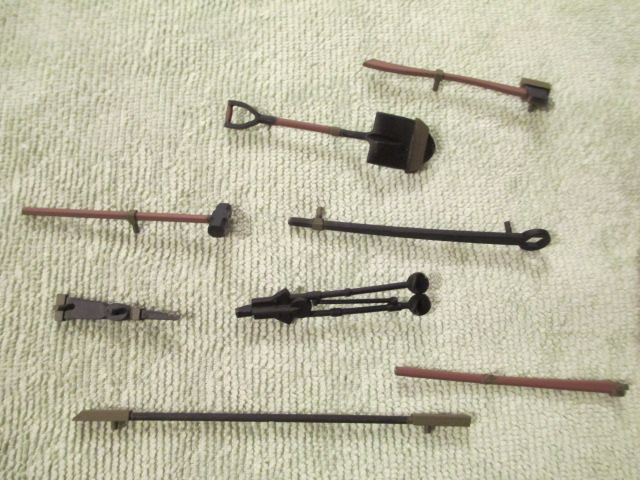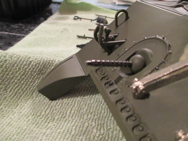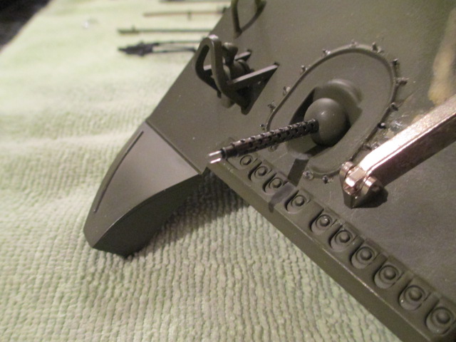 55th Day: The optical fiber I had ordered from Germany arrived today and I used the Tamiya brand section to test the bow .30 cal. I followed Tamiya's instructions and sanded the shaft lightly until it was dull in appearance leaving both ends glossy. It looked great, very bright from all angles but the HL LED must be slightly larger than the one that Tamiya uses because I ended up taking a very tiny slice off one end using a #11 exacto to leave just a small portion of the optical fiber showing. Next I took up the tools. I was planning on using heat shrink to define the molded on mounts and use a bent staple for the buckle, similar to what Phil had done on his excellent Sherman build. Looking the tools over, I was once again struck by their similarity to the Tamiya tools and in the end, since the night was getting late, decided to just do a detailed paint job and see how they looked on the tank after it was painted. I could always revisit them and add heat shrink strapping and metal buckles if they were needed. I used Olive Drab and Steel and Flat Black for the metal portions and used a mix of Wood and Flat Brown to make a realistic looking set of handles. Pictures: