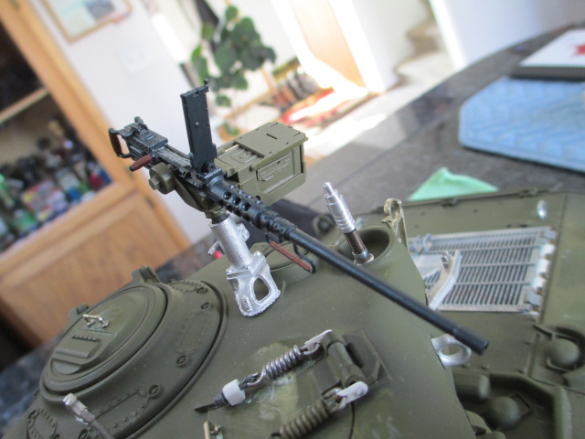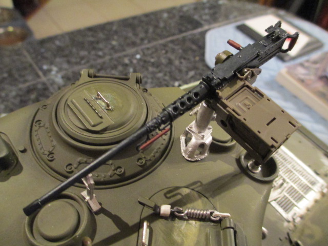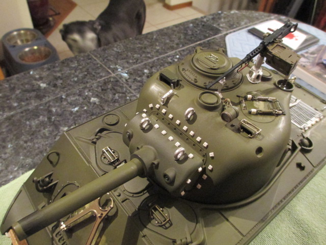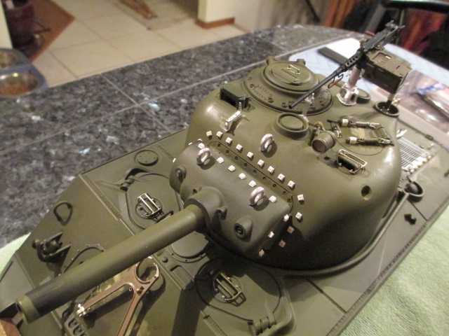 64th Day: Thank you again, CH. I made good progress today and will keep it up this week. So, taking the tank apart, I put in new LEDs for the tail lights since the originals had stopped working. Upon removing the old bulbs with the aid of Debonder on the Guards, I found that they were blown. I figured that this happened when the original LED for the Searchlight went south and got out the torch and soldered some new ones in after testing them to make sure that they worked. Put everything back together and hooked up the new battery. Still no tail lights. I eventually traced the issue to the small board at the bow of the tank where the turret 3 pin plug and the plug from the RX-18 go. There is a small scorch spot on the solder for the ground leading to the tail lights. I will have to replace the board when I find one. Even then, I am in for a spot of soldering. At least everything else electrical is working fine. I spent a couple of hours painting the .50 cal and am pleased with the results. Lastly, I removed the armored periscope cover from the spare MATO M4A1 turret and it is a perfect fit for the M4A3's turret. Pics: