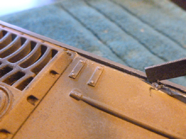 First on the List was removing the "extra" aerial tube mounted on the ( looking from the rear ) left hand side. Why HL added this must have been one of their anti copy right measures. Reading this forum I have learnt that this is wrong and needed correcting as it was only on the opposite side the tube was mounted . After using the Dremmel to remove most of the tube , the flat area's were carefully re-profiled using a fine file . While re-profiling the tube location , I used the same file to score a groove into the original weld line ready for some milliput beading. Next was removing the original early production Feifel air intake and brackets . I find the best way to remove these glued on peg mounted details is to use a file and remove most of the peg showing by scraping / filing it off . Then using a small pointed screwdriver , simply push on the head of the pin and it should "pop" out . This Mid / Late production air intake was added, while the Feifel air intake was discontinued from the factory spec beginning September 1943, It seems that it took several month and many combinations of old and new before this style of intake was standard by the time Tiger 131 was produced in Nov / Dec 43. The missing engine lifting handles broken off a long time ago were added using good old paper clips !