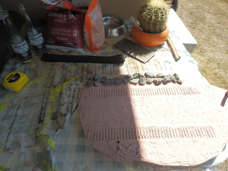plastered the board with a mix of plaster of paris and potting mix. A bit of umber paint ,which turned the plaster pink !!, and leaf mix out of the blender.