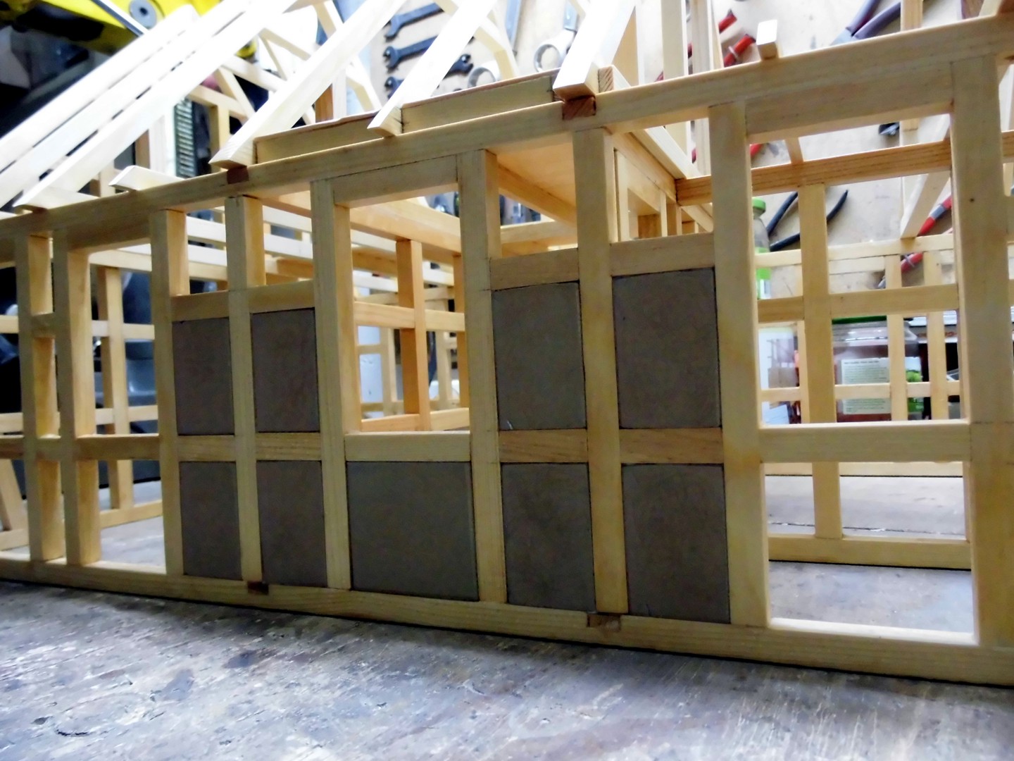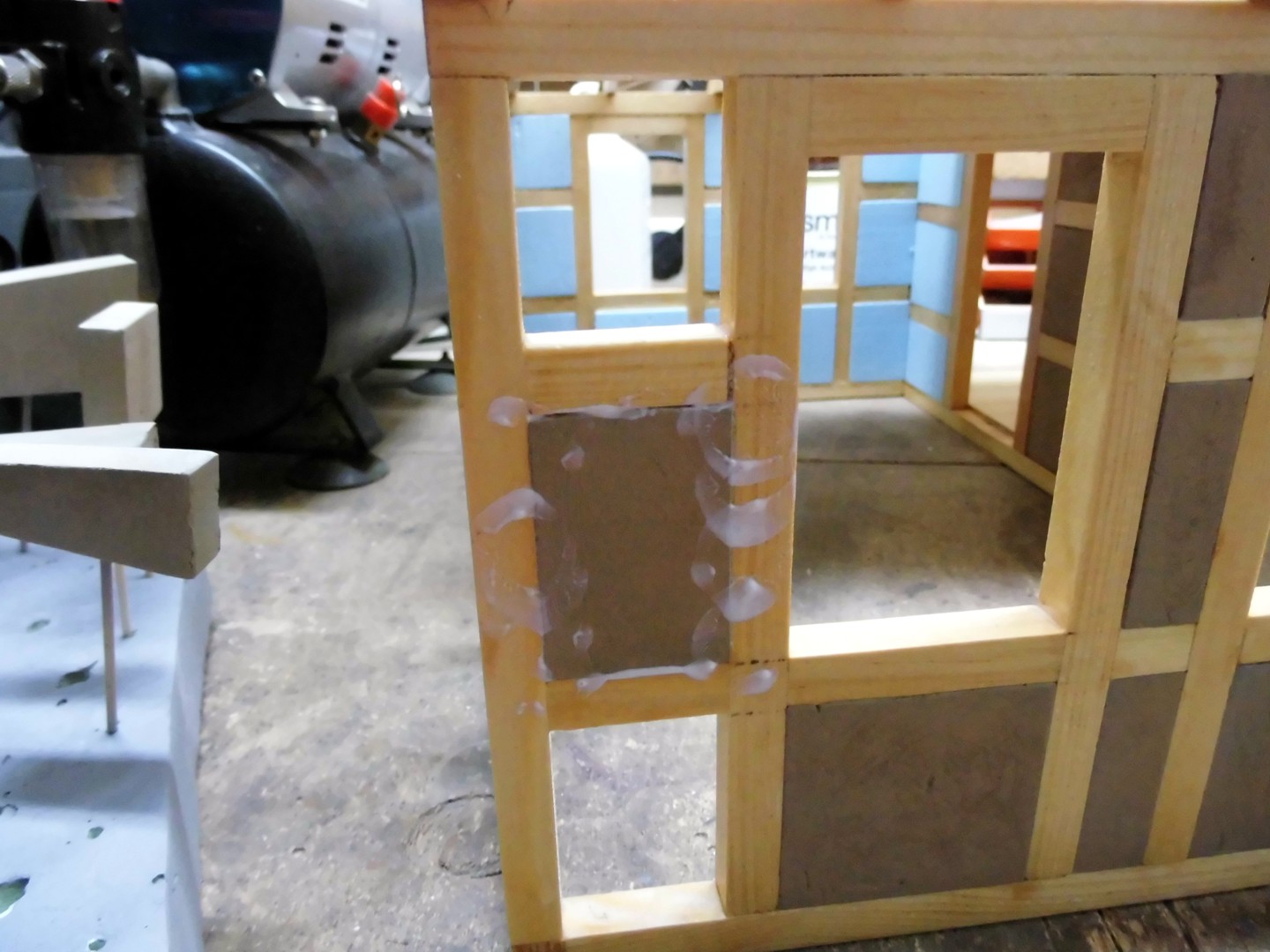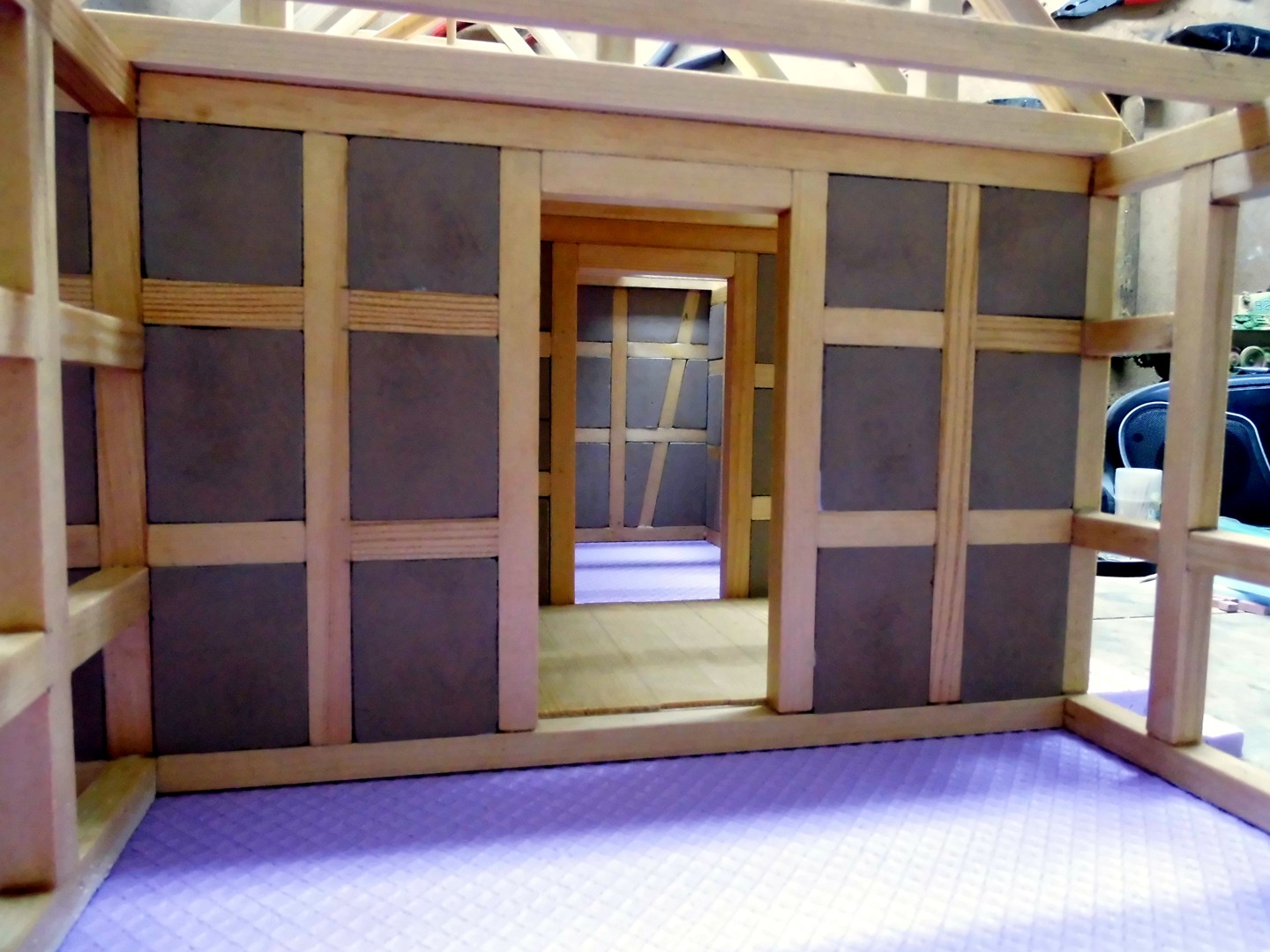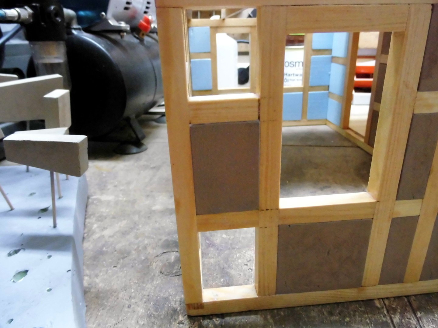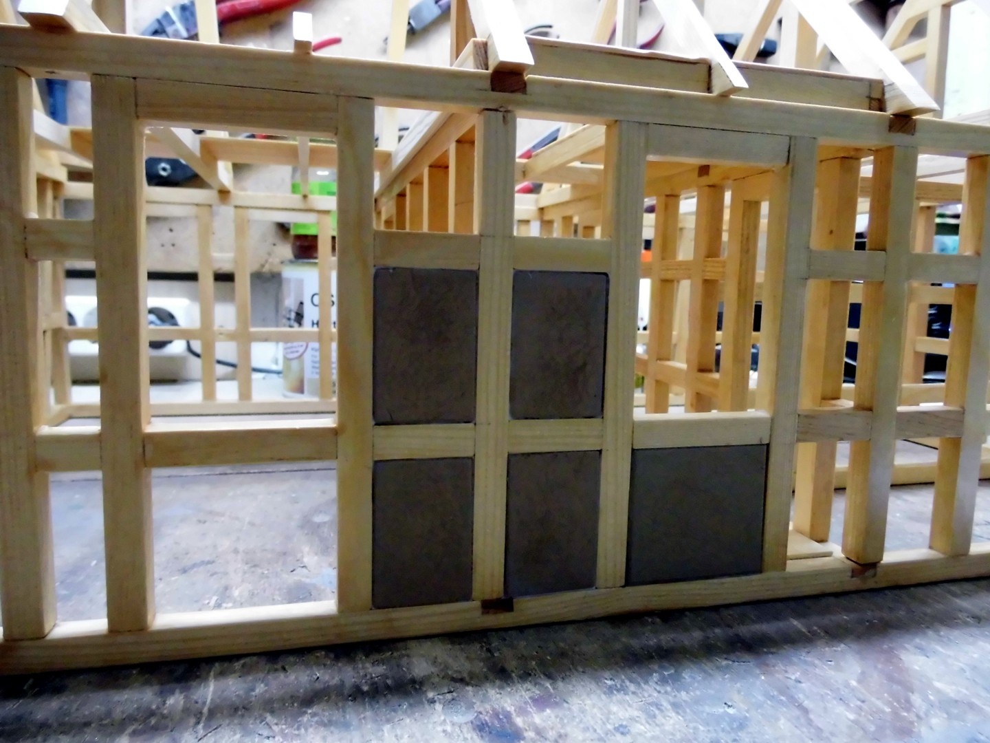 All timberings were measured and the measurements transferred onto a foam board, then I cut them out with a scalpel. Note that I have with a sanding file the edges lightly broken and a few light circles at the flat sides sanded (for a plastered surface).