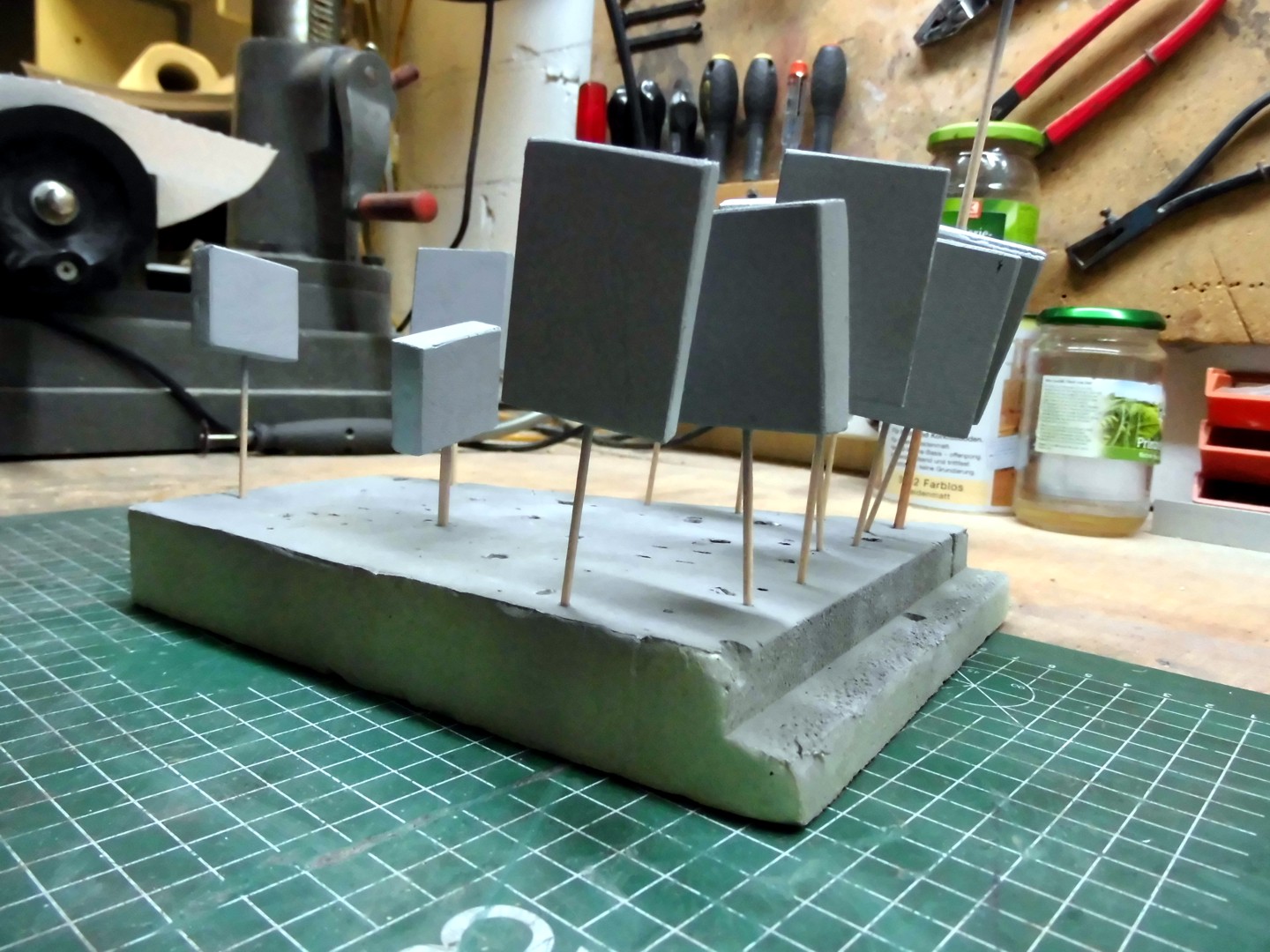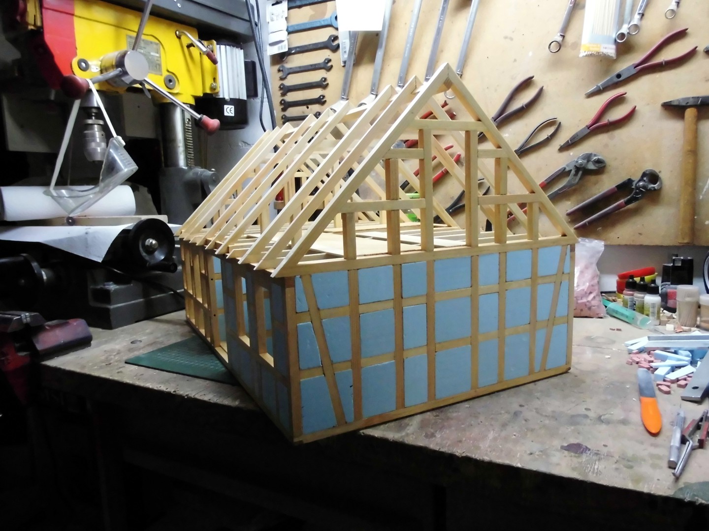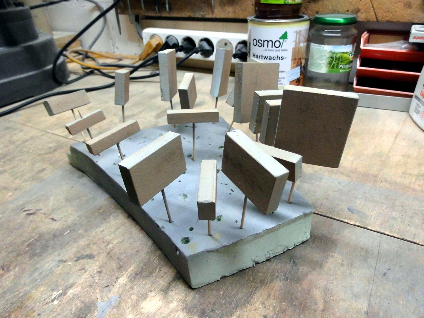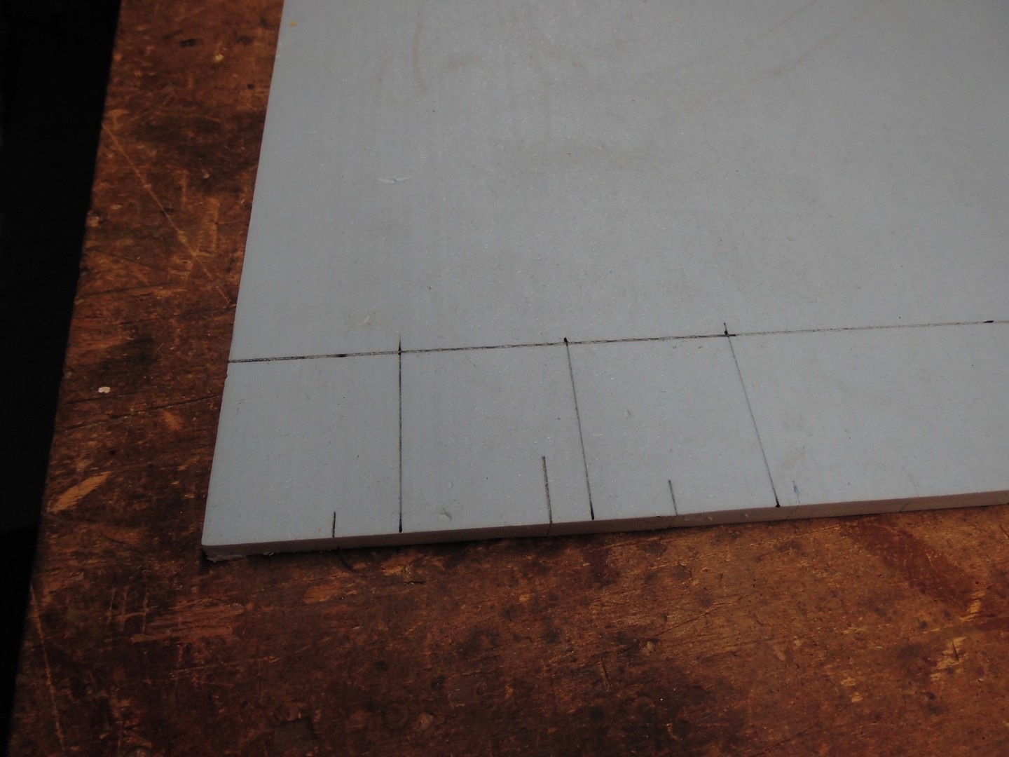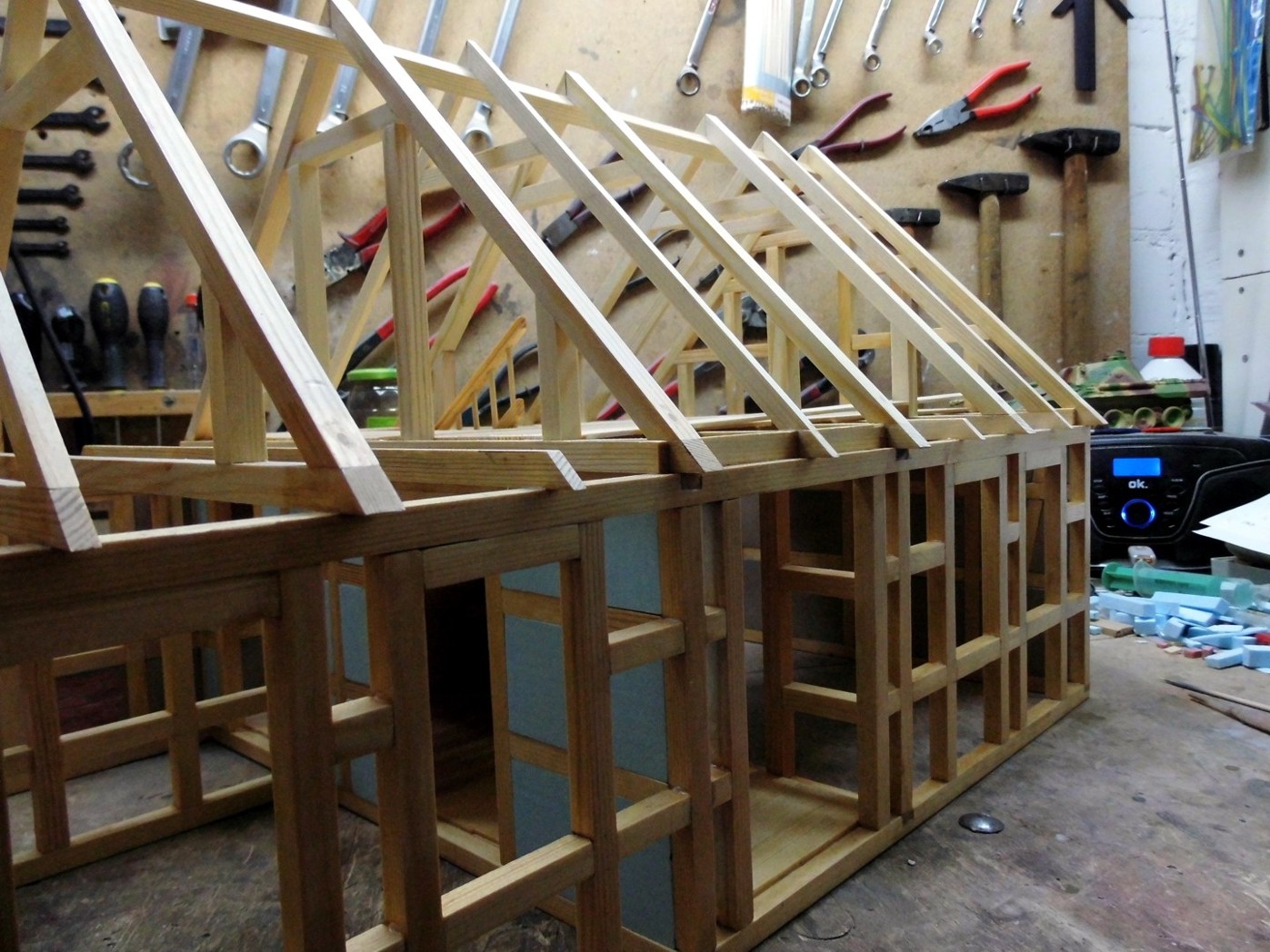 All timberings were measured and the measurements transferred onto a foam board, then I cut them out with a scalpel. Note that I have with a sanding file the edges lightly broken and a few light circles at the flat sides sanded (for a plastered surface).
