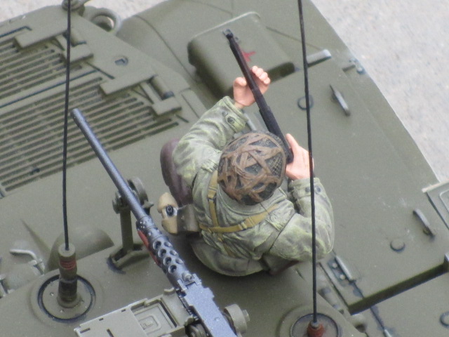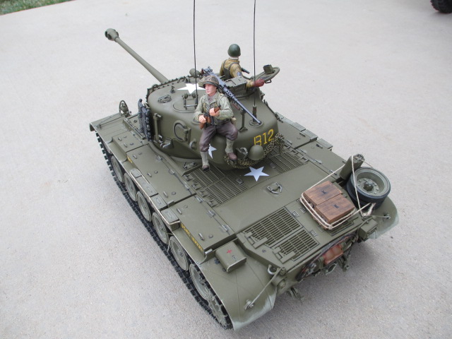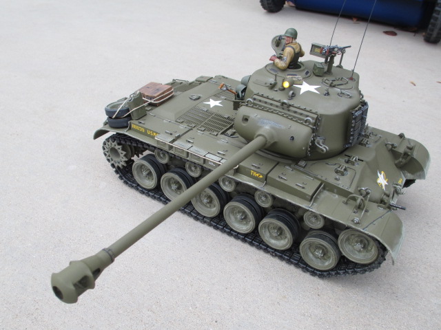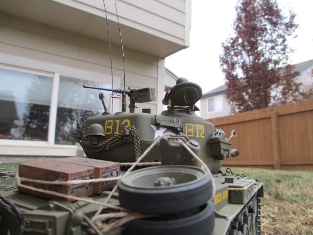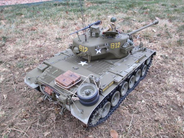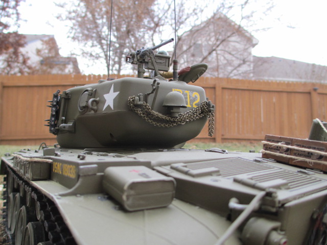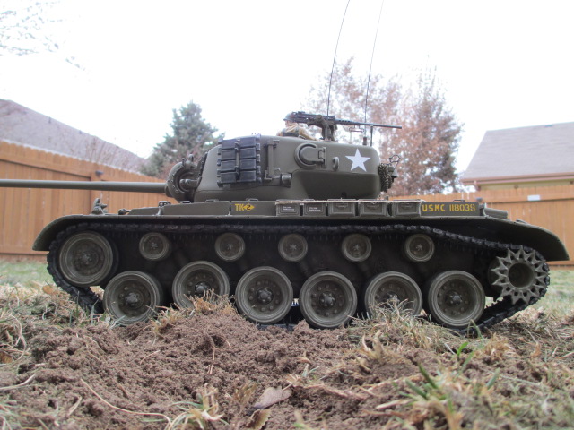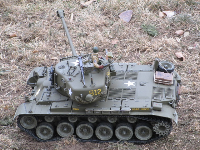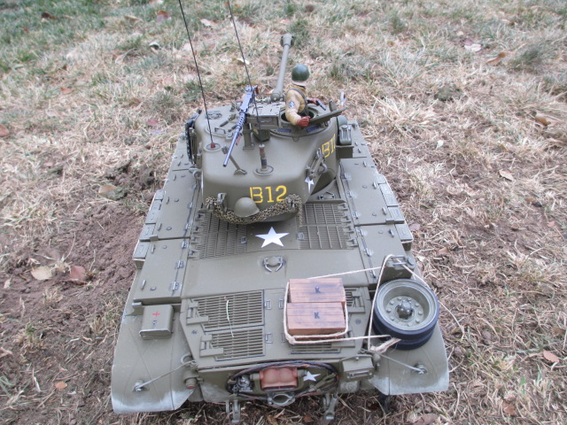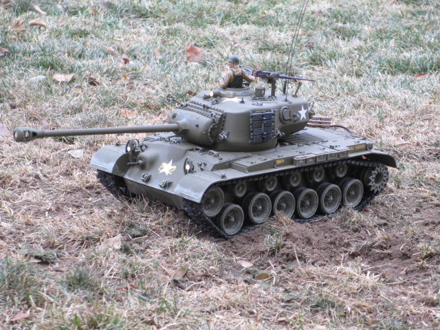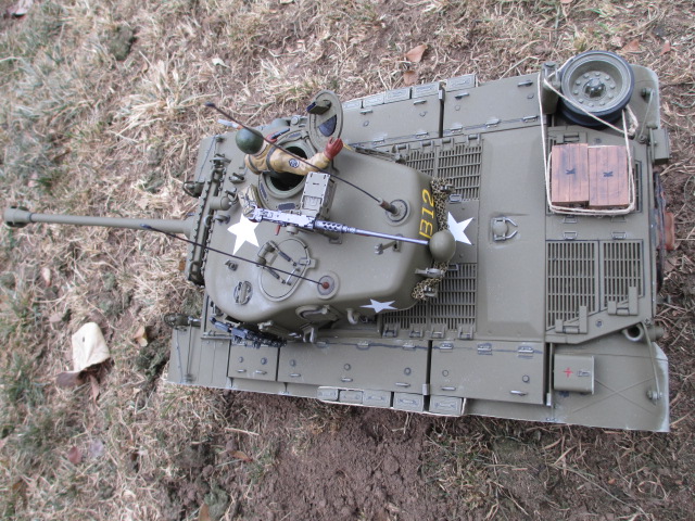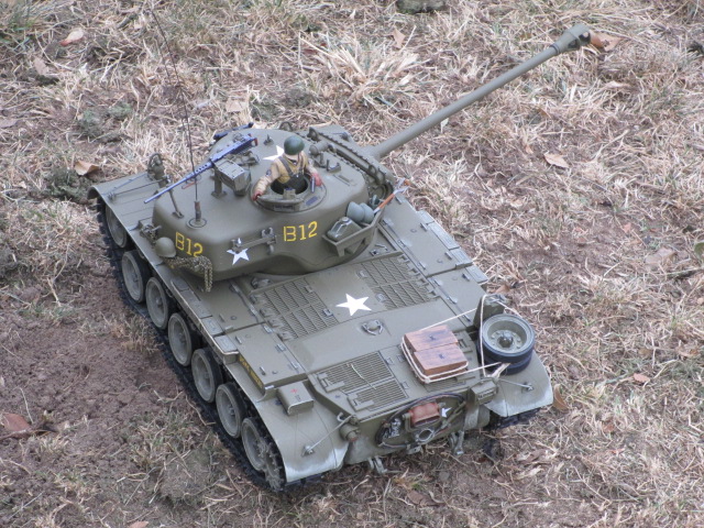 PainlessWolf wrote:Part B A beautiful and warm ( 40's ) morning with no snow on the ground so out comes 'B-12' and the battery is charging and Smoker checked. WIring looked over and everything working. While the tank's battery charged and the camera battery charged, I decided to address one last, little lingering doubt I had about this tank. The new tracks seemed too tight to me. They were impeding the suspension when going over anything. As the suspension on this tank is time tested and smooth, the only solution was to add a link to each side. I have plenty of extra track so that was done. Huge change again in the way that the tank ran! Engines were immediately quiet and no pull was exhibited at center stick. Watching the tracks flex with the suspension now gave me a huge thrill! Extra realism added for a few minutes work. Everything back together and charged, I went outside just as a HUGE gust of wind brought dark clouds over and flurries of snow began to blow horizontal. *Laughs* Going to be a bit hard to replicate Summer in these conditions but the Pershing was up to the task. Grass and scrub that had stalled the tank out earlier this year was no match for it now. I was going to get elaborate and have a T-34\85 off in the distance as a threat, etc. but the 60-70mph winds were effectively stopping my Smoker from functioning so I did did some closeups and called it a day. Pictures: