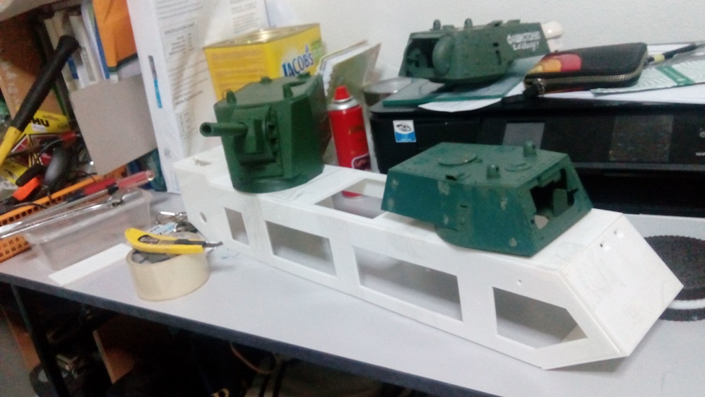 done with the right side of the hull wall and now moving on to the floor and mounting. the turrets are just size comparison and just for fun hahahahaha